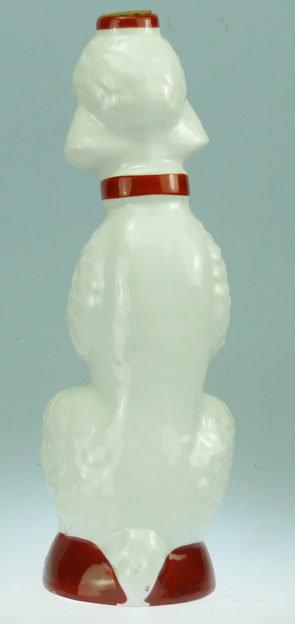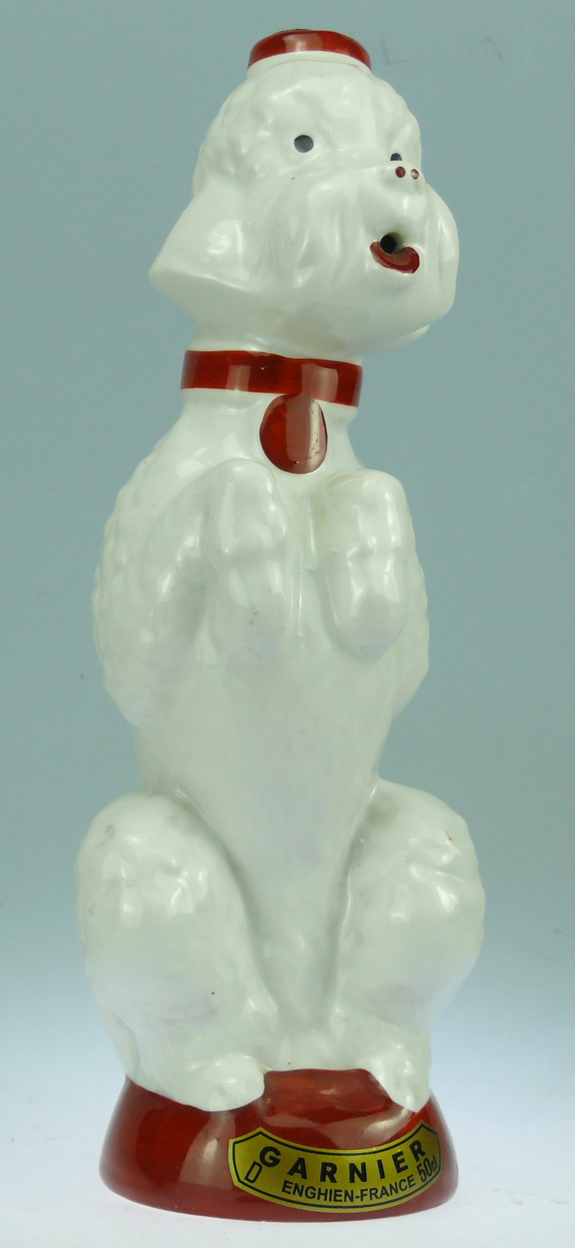 Avers : Bouteille en céramique émaillée représentant un caniche blanc assis faisant le beau. La bouteille a encore son bouchon mais il manque le petit bouchon au niveau de la gueule du chien. Ce modèle existe également en noir. Cette bouteille possède une étiquette ancienne GARNIER – ENGHIEN-FRANCE 50 cl. et une inscription en dessous : GARNIER. Elle est répertoriée à la page 182 sous le numéro Gar-139 dans l’ouvrage : Catalogue Raisonné, « Les bouteilles Garnier Liqueurs », aux Editions : Monnaies d’Antan. 24 cm