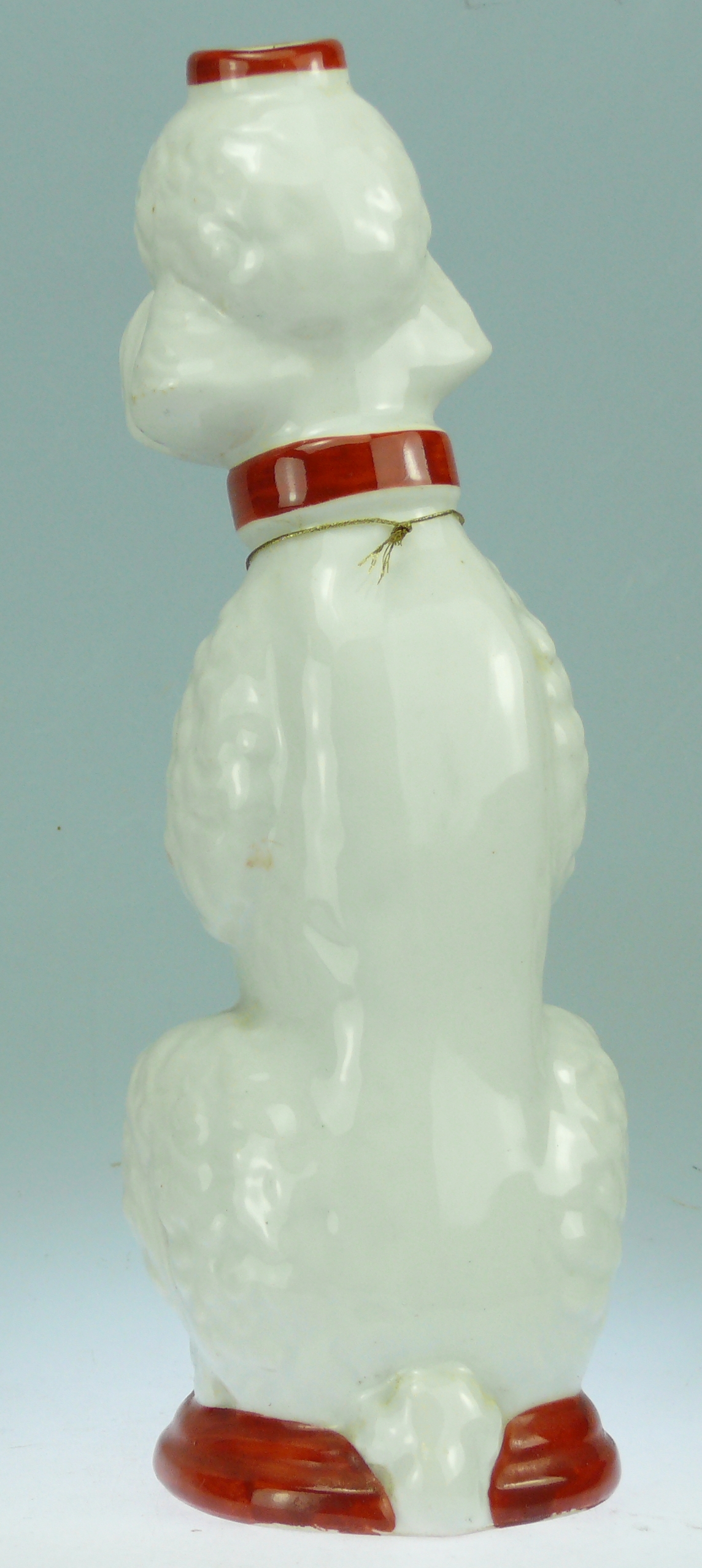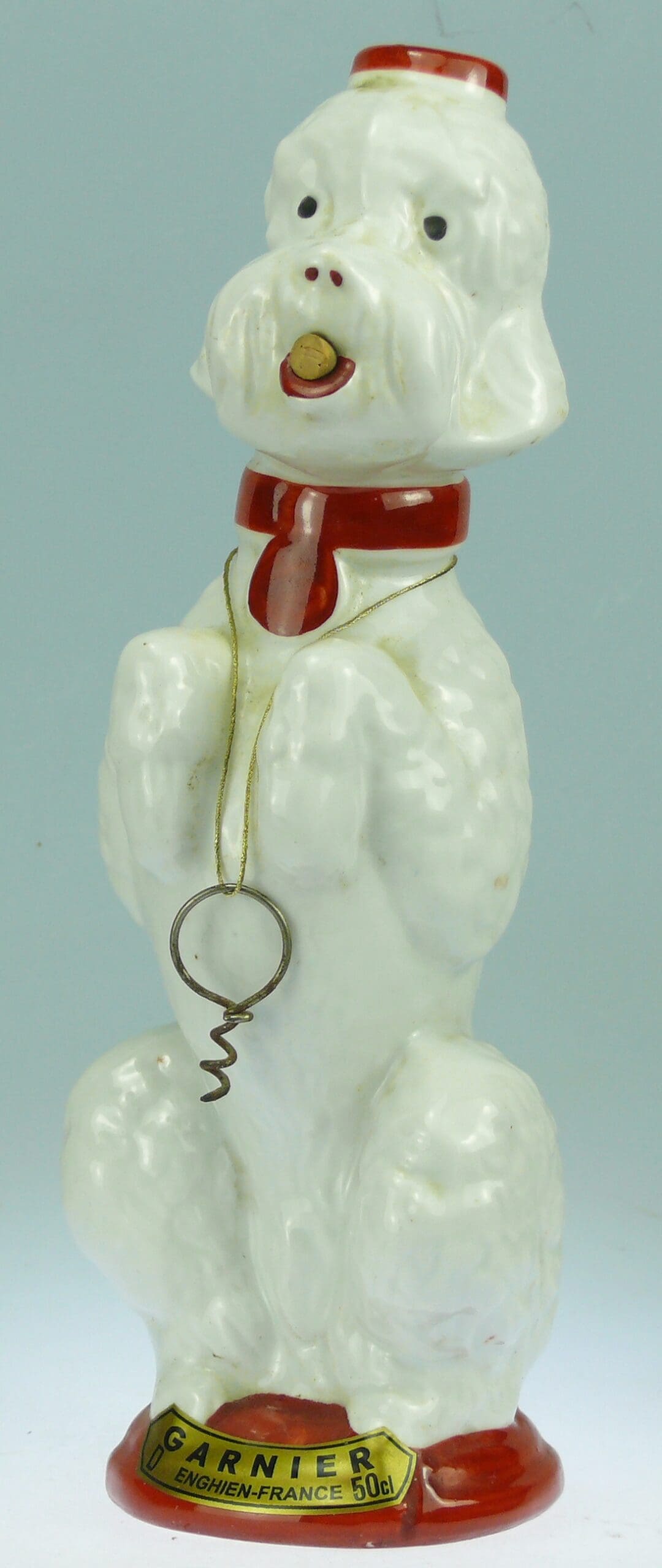 Avers : Bouteille en céramique émaillée représentant un caniche blanc assis faisant le beau. Manque le bouchon mais a encore son petit bouchon au niveau de la gueule du chien ainsi que son petit tire-bouchon autour du cou de l’animal. Ce modèle existe également en noir. Cette bouteille possède une étiquette ancienne GARNIER – ENGHIEN-FRANCE 50 cl. et une inscription en dessous : GARNIER Liqueurs FRANCE. Elle est répertoriée à la page 182 sous le numéro Gar-139 dans l’ouvrage : Catalogue Raisonné, « Les bouteilles Garnier Liqueurs », aux Editions : Monnaies d’Antan. 24 cm