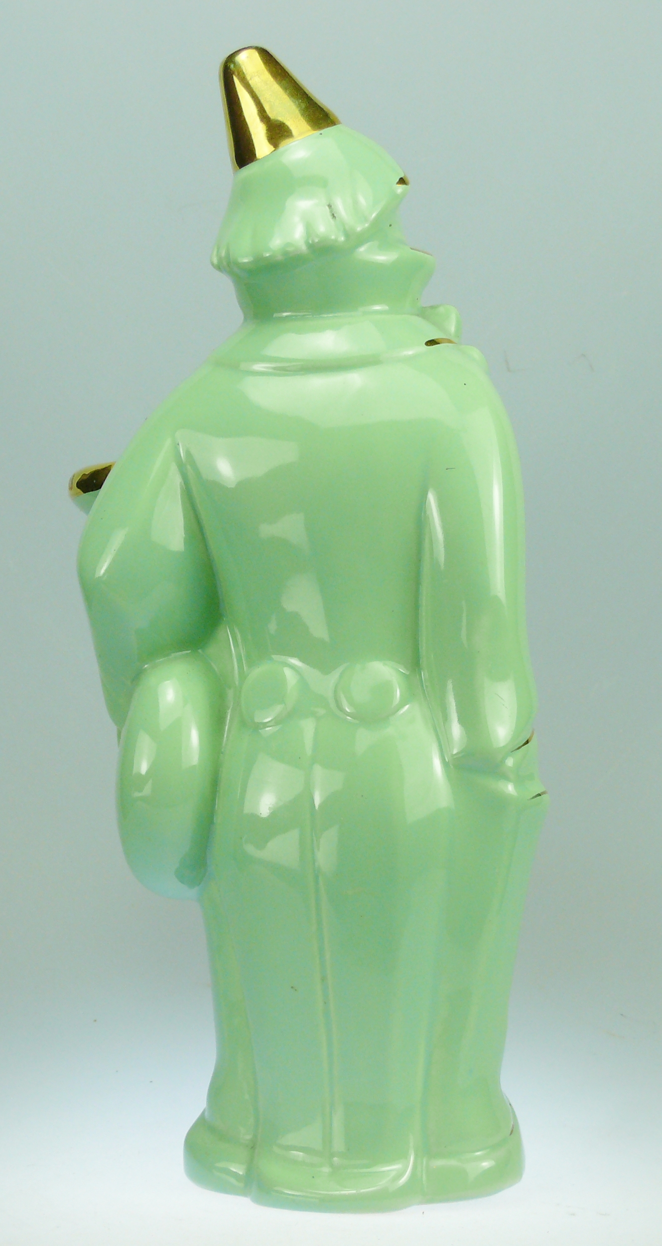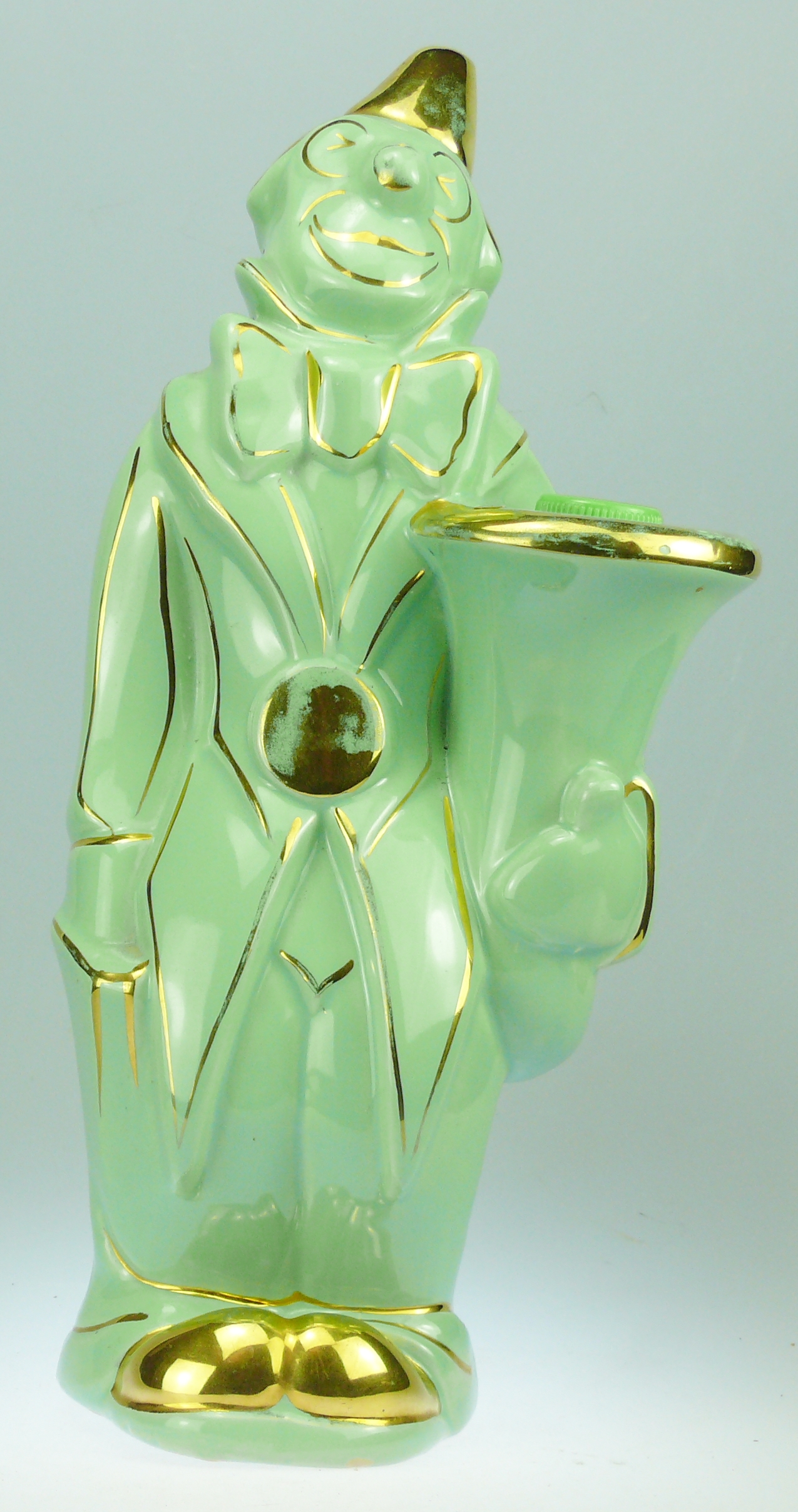 Avers : Bouteille en céramique émaillée de couleur verte à liserés dorés représentant un clown tenant son tuba sous le bras. La bouteille a son bouchon de liège dans le tuba et un plus petit à la pointe du chapeau. Flacon inscrit en dessous : GARNIER Liqueurs – ENGHIEN-PARIS. A noter des manques au niveau de certains liserés dorés, sur le bouton de la veste et sur le chapeau. Un fragment d’étiquette ancienne sur le bord du tuba. Bouteille répertoriée à la page 181 sous le numéro Gar-137 dans l’ouvrage : Catalogue Raisonné, « Les bouteilles Garnier Liqueurs », aux Editions : Monnaies d’Antan. 33 cm
