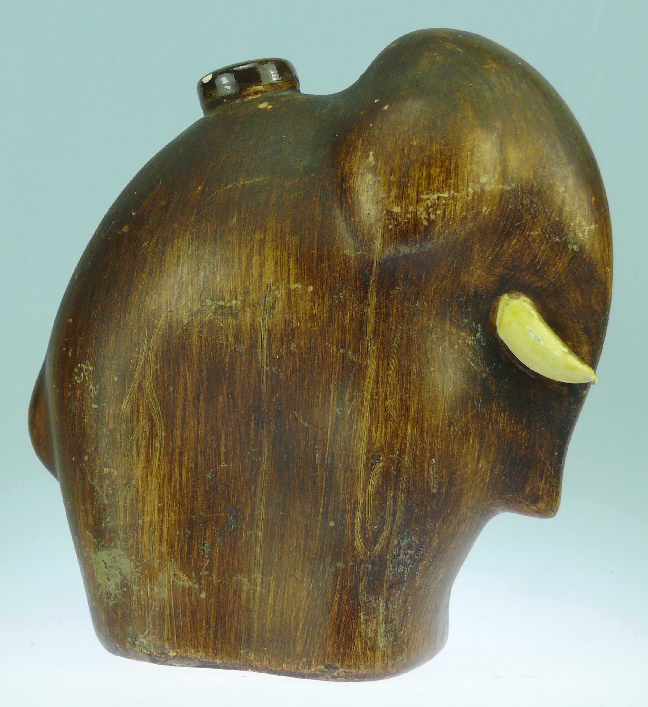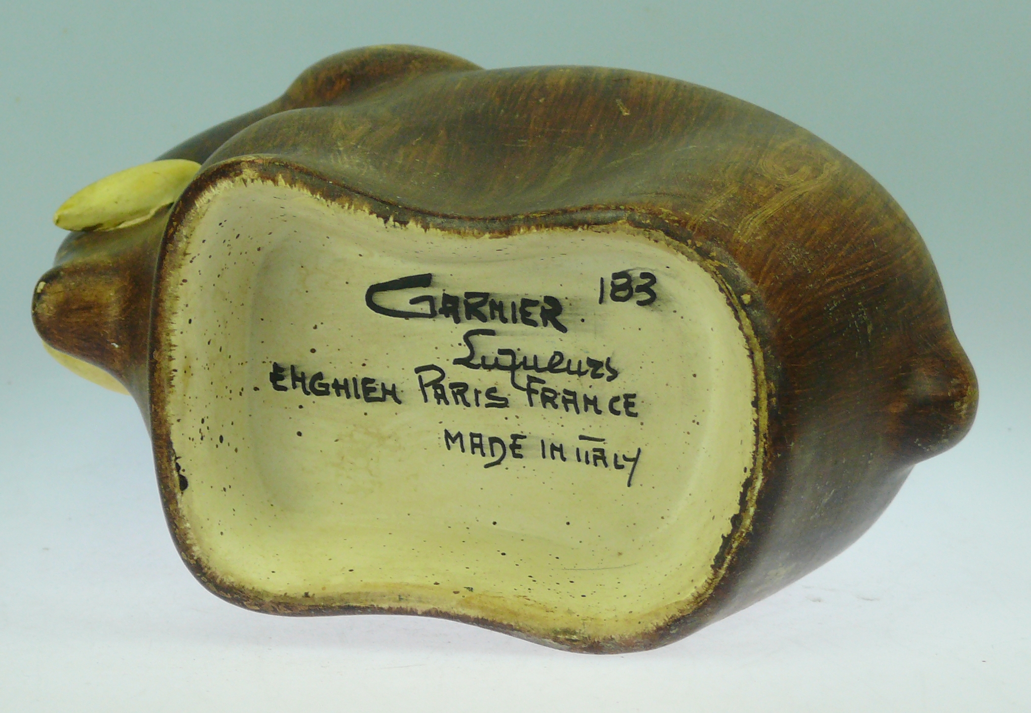 Avers : Bouteille en céramique émaillée représentant un éléphant très simplifié. Peinture marron foncé avec finition d’aspect bois donnant un effet très moderne au flacon. Manque le bouchon. cette bouteille est inscrite en dessous : GARNIER Liqueurs 183 – ENGHIEN PARIS FRANCE – MADE IN ITALY. Elle est répertoriée à la page 202 sous le numéro Gar-183 dans l’ouvrage : Catalogue Raisonné, « Les bouteilles Garnier Liqueurs », aux Editions : Monnaies d’Antan.17 cm
