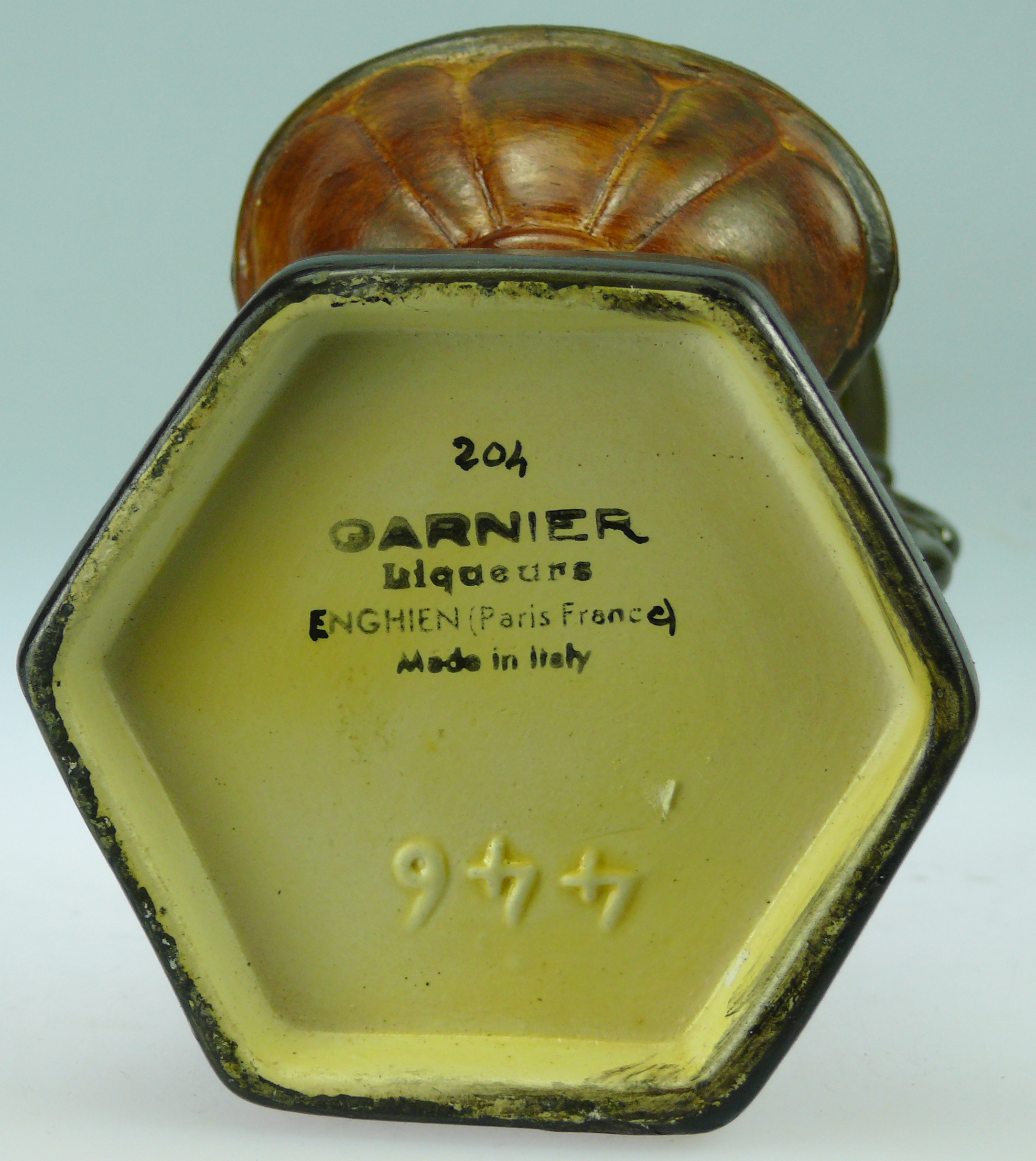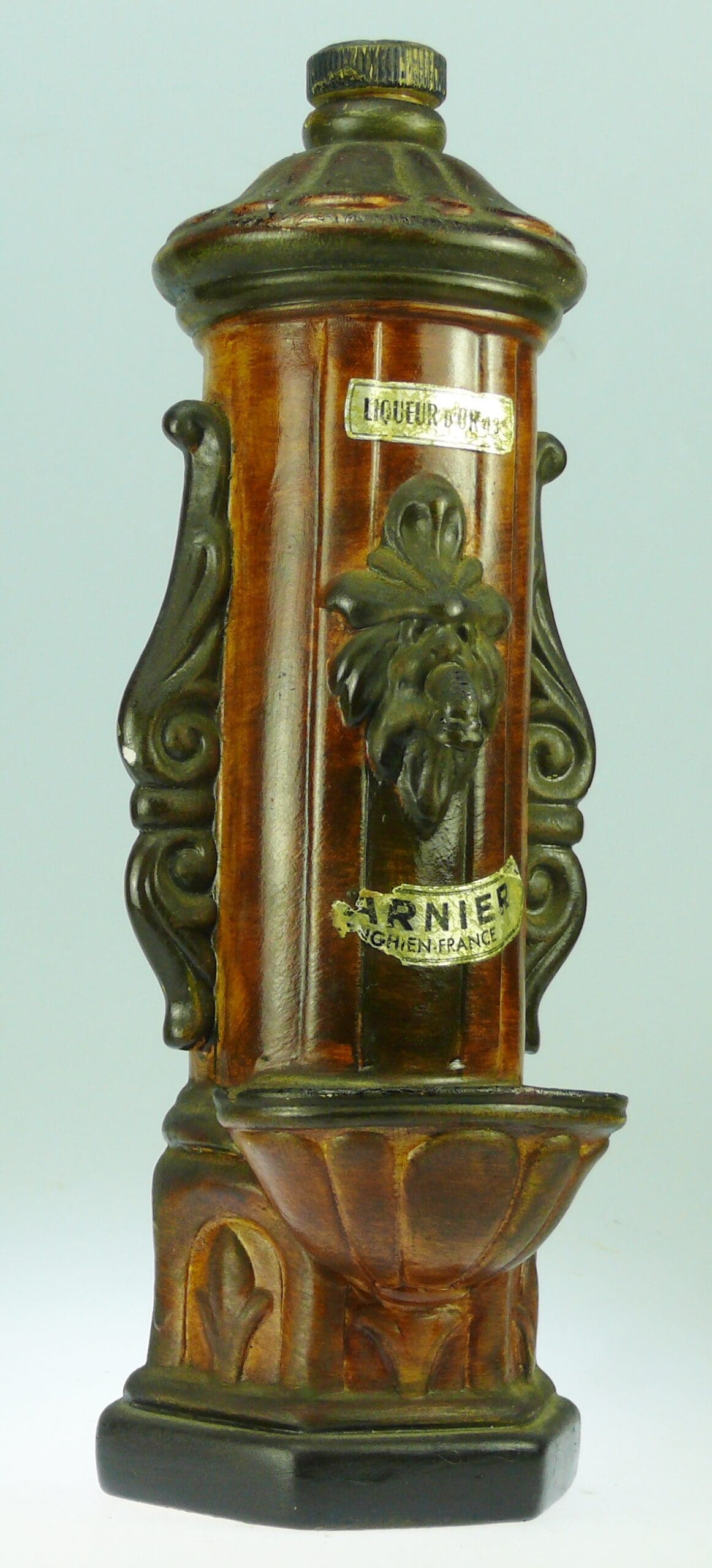 Avers : Bouteille en céramique émaillée de forme cylindrique, de couleur marron et bronze, représentant une fontaine à eau à la française avec sa bassine. La bouteille est ornée d’une chapiteau et de 2 grands volutes sur les côtés. An cienne étiquette LIQUEURS D’OR 43° et ancienne étiquette partielle GARNIER – ENGHIEN FRANCE. En dessous, en noir : 204 – GARNIER – Liqueurs – ENGHIEN (Paris France) – Made in Italy. N° 446 en relief. Bouteille répertoriée à la page 213 sous le numéro Gar-204 dans l’ouvrage : Catalogue Raisonné, « Les bouteilles Garnier Liqueurs », aux Editions : Monnaies d’Antan. 30 cm