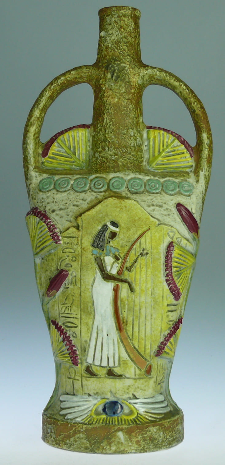Avers : Bouteille en céramique représentant une amphore à 2 anses arrondies, la panse ornée d’un décor émaillé de femme égyptienne debout, jouant de la harpe. Bouteille référencée KLEM-8101, page 347 de l’ouvrage : Catalogue Raisonné, « Les bouteilles Garnier Liqueurs », aux Editions : Monnaies d’Antan. Estampilléé au-dessous : KLEM FRANCE autour du logo de la fabrique Borghini Lacrima Christi. Manque le bouchon. 29 cm.