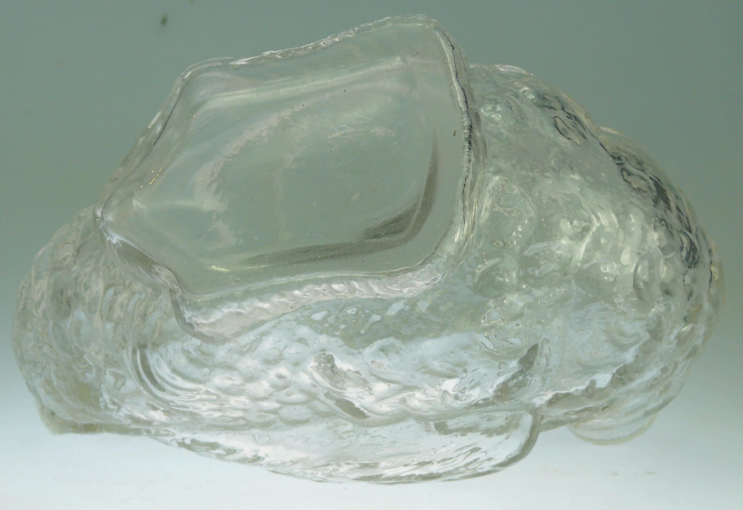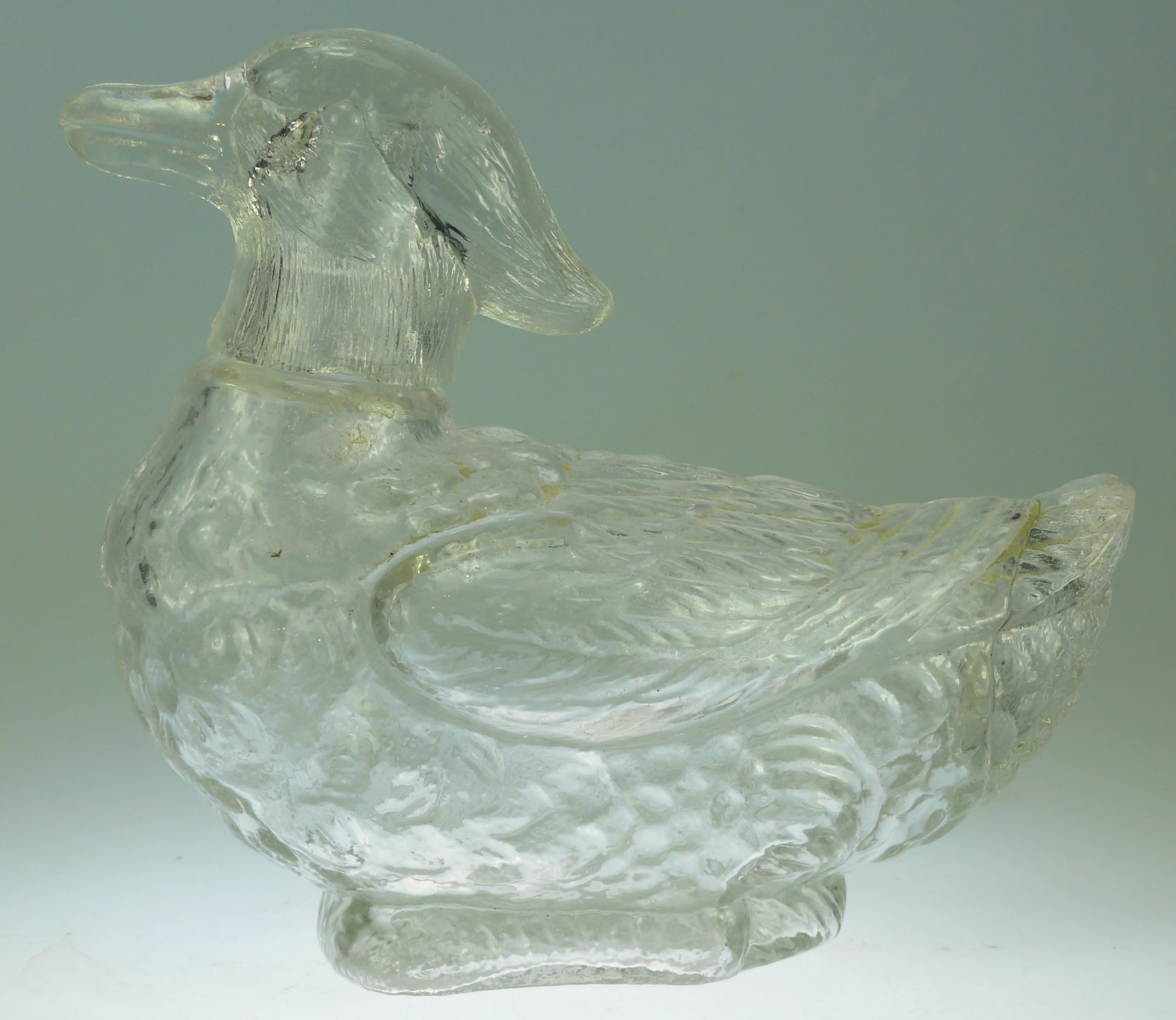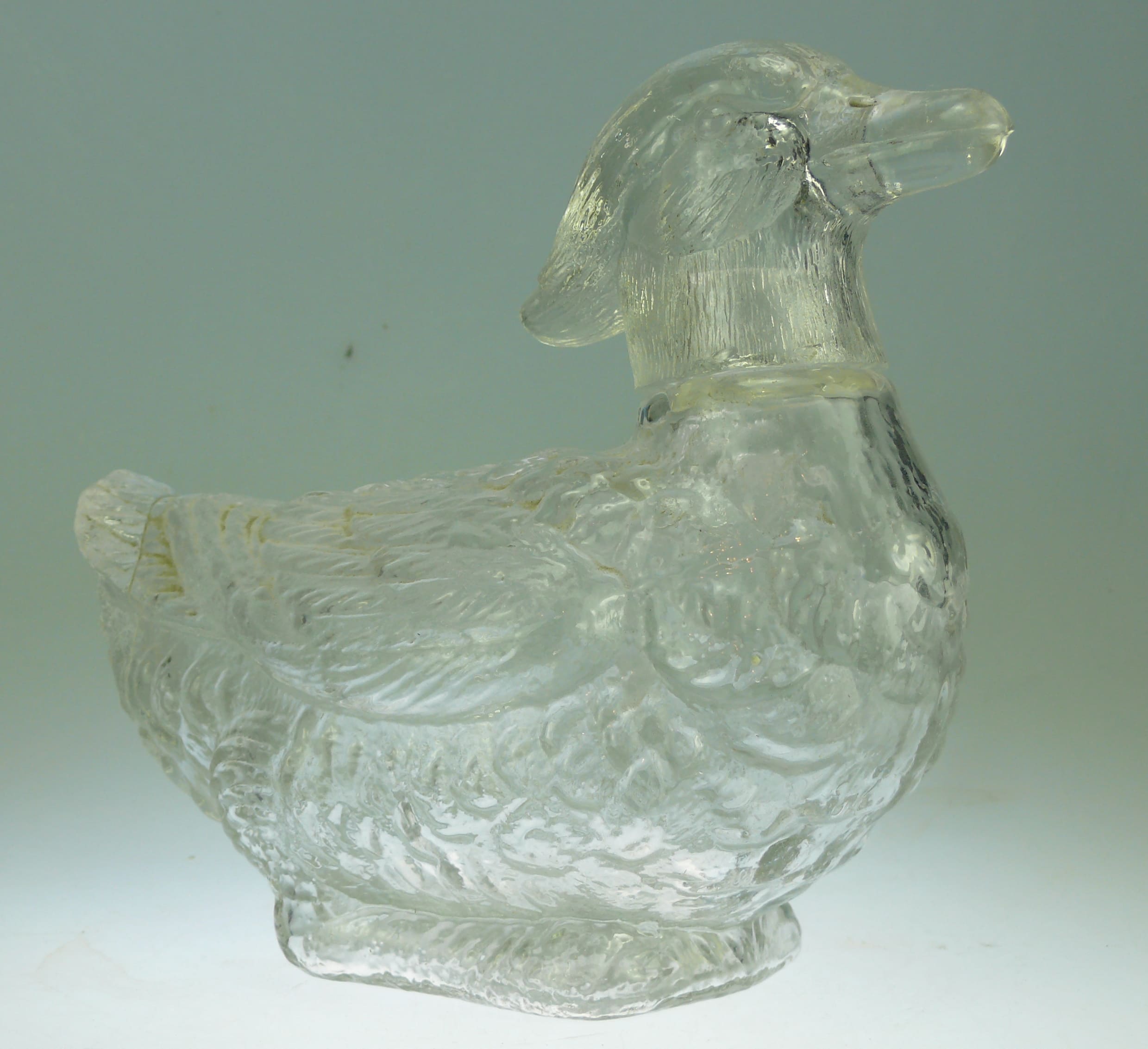 Avers : Bouteille Legras en verre moulé représentant un canard, la tête de l’oiseau faisant office de bouchon. Bouteille ayant été utilisée par Garnier dans les années 1911 et répertoriée dans le Catalogue Raisonné, « Les bouteilles Garnier Liqueurs », aux Editions : Monnaies d’Antan sous le numéro 1911/96, à la page 123. Des petits éclats sur le haut du goulot et à la base du bouchon. 17 cm.