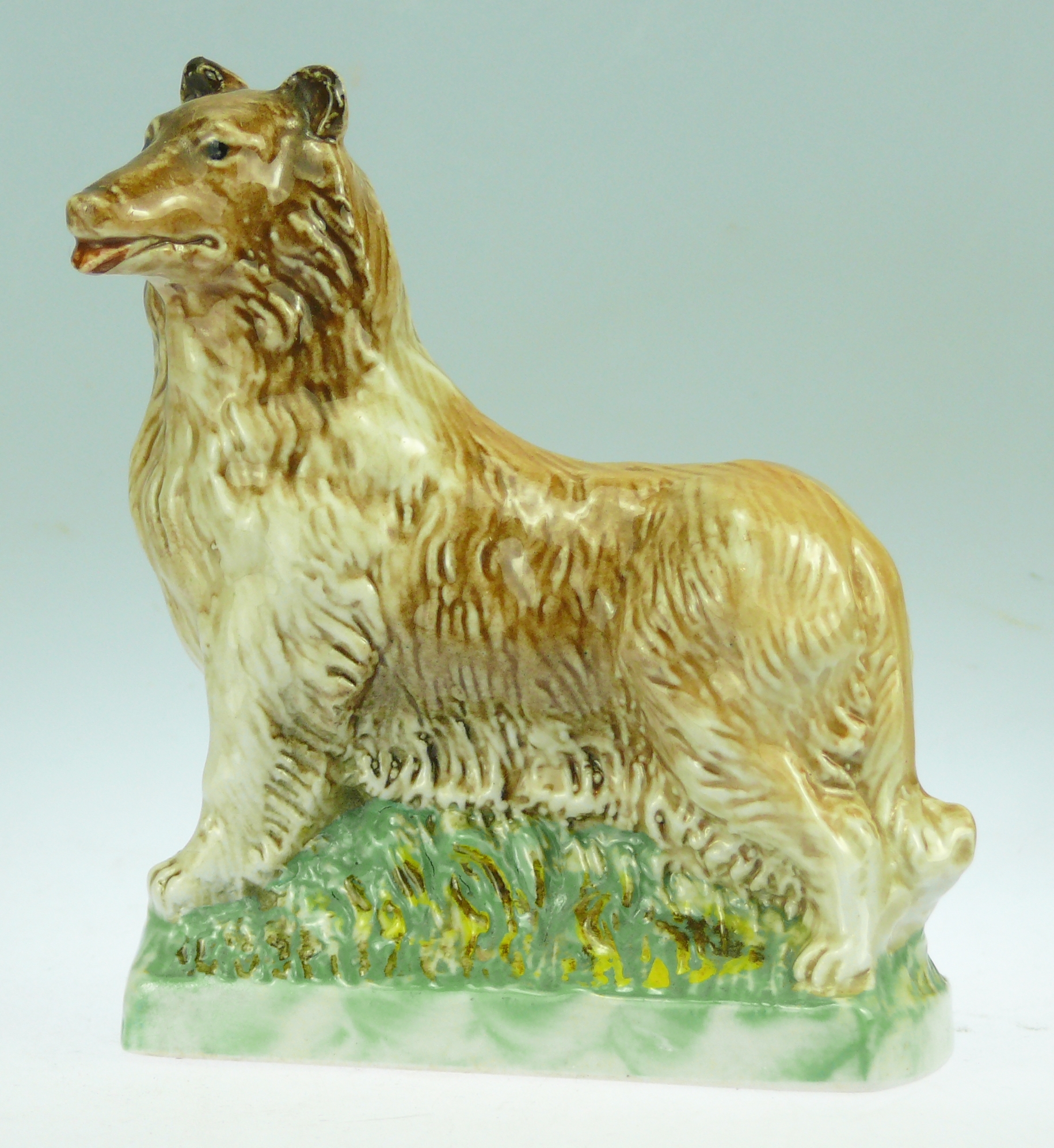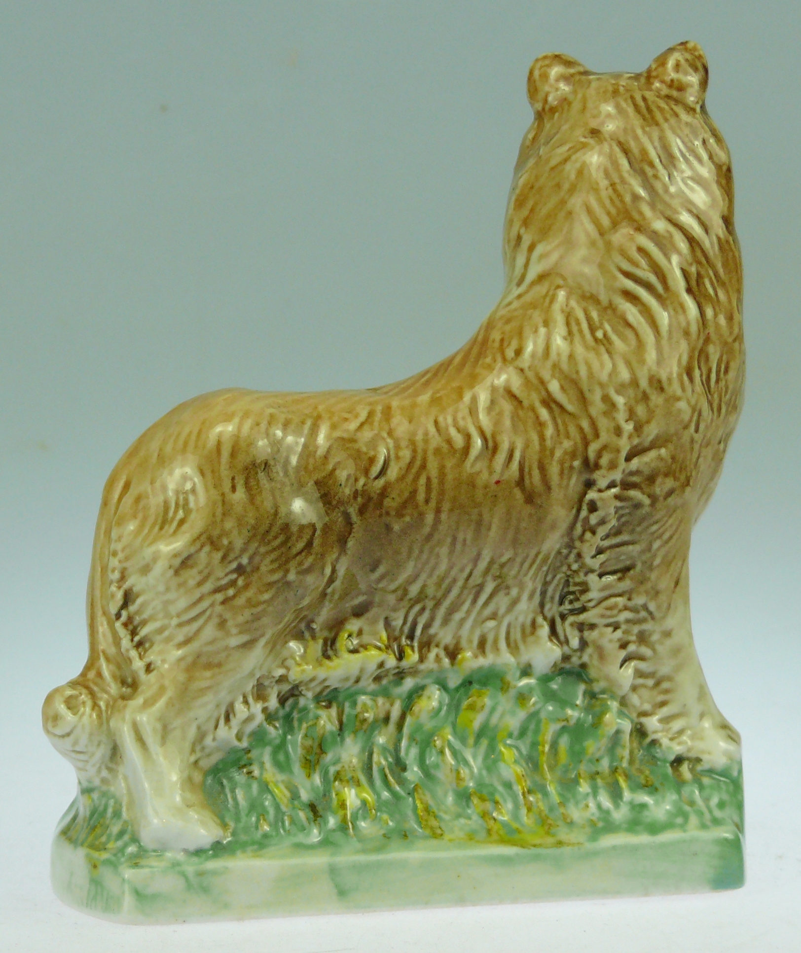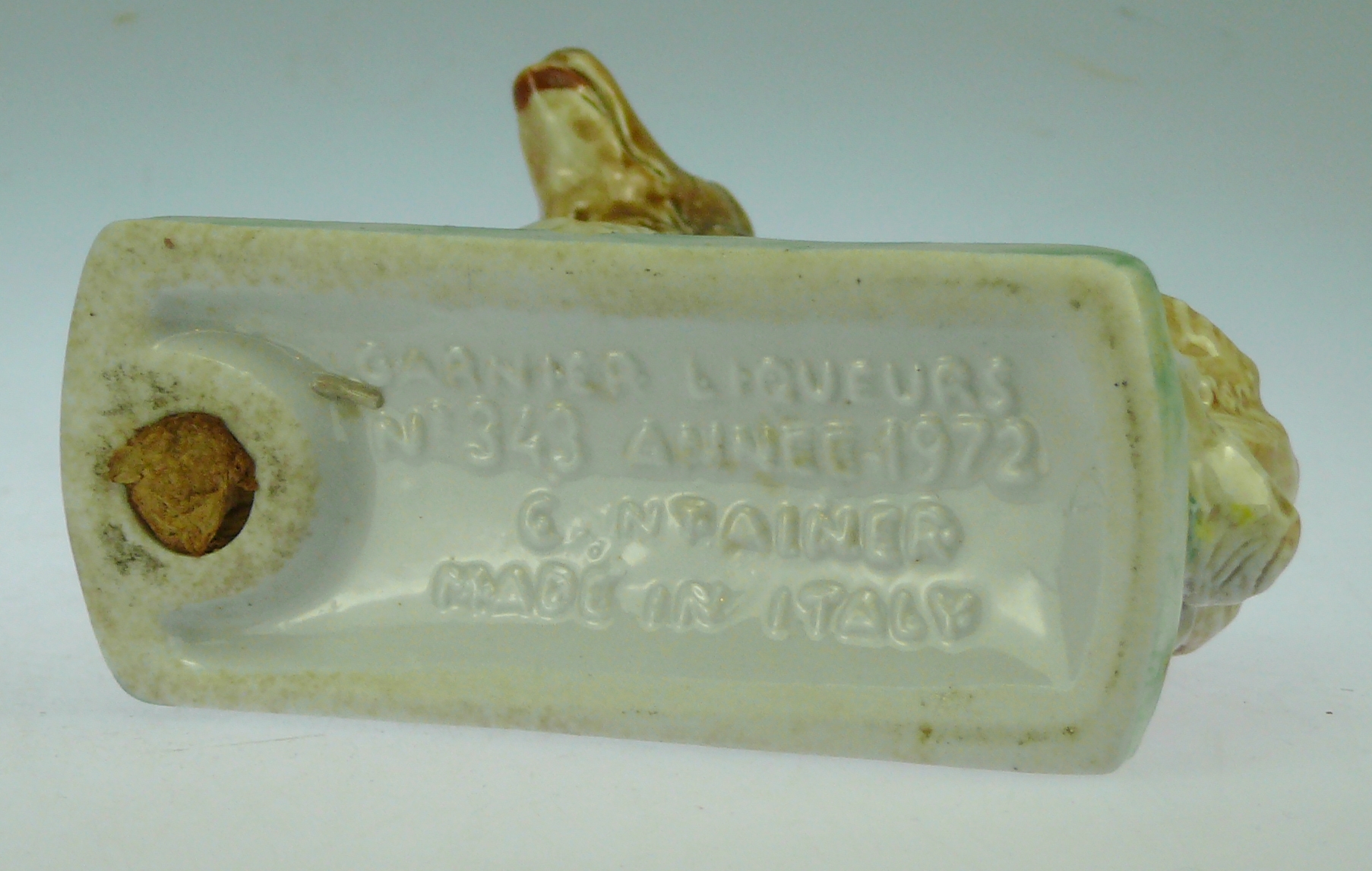 Avers : Bouteille miniature en céramique émaillée en forme de chien Colley (Collie dog). La bouteille a encore son bouchon en liège. Le flacon est estampillé en dessous : GARNIER LIQUEURS – N° 343 ANNEE 1972 – CONTAINER – MADE IN ITALY. Cette bouteille fait partie de la série des 6 miniatures « Les chiens » et figure sous le numéro 343 à la page 262 de notre ouvrage Catalogue Raisonné, « Les bouteilles Garnier Liqueurs », aux Editions : Monnaies d’Antan. Sur cette page nous avons indiqué 2 épreuves de ce flacon avec des différences de teintes au niveau du poil de l’animal. 11 cm