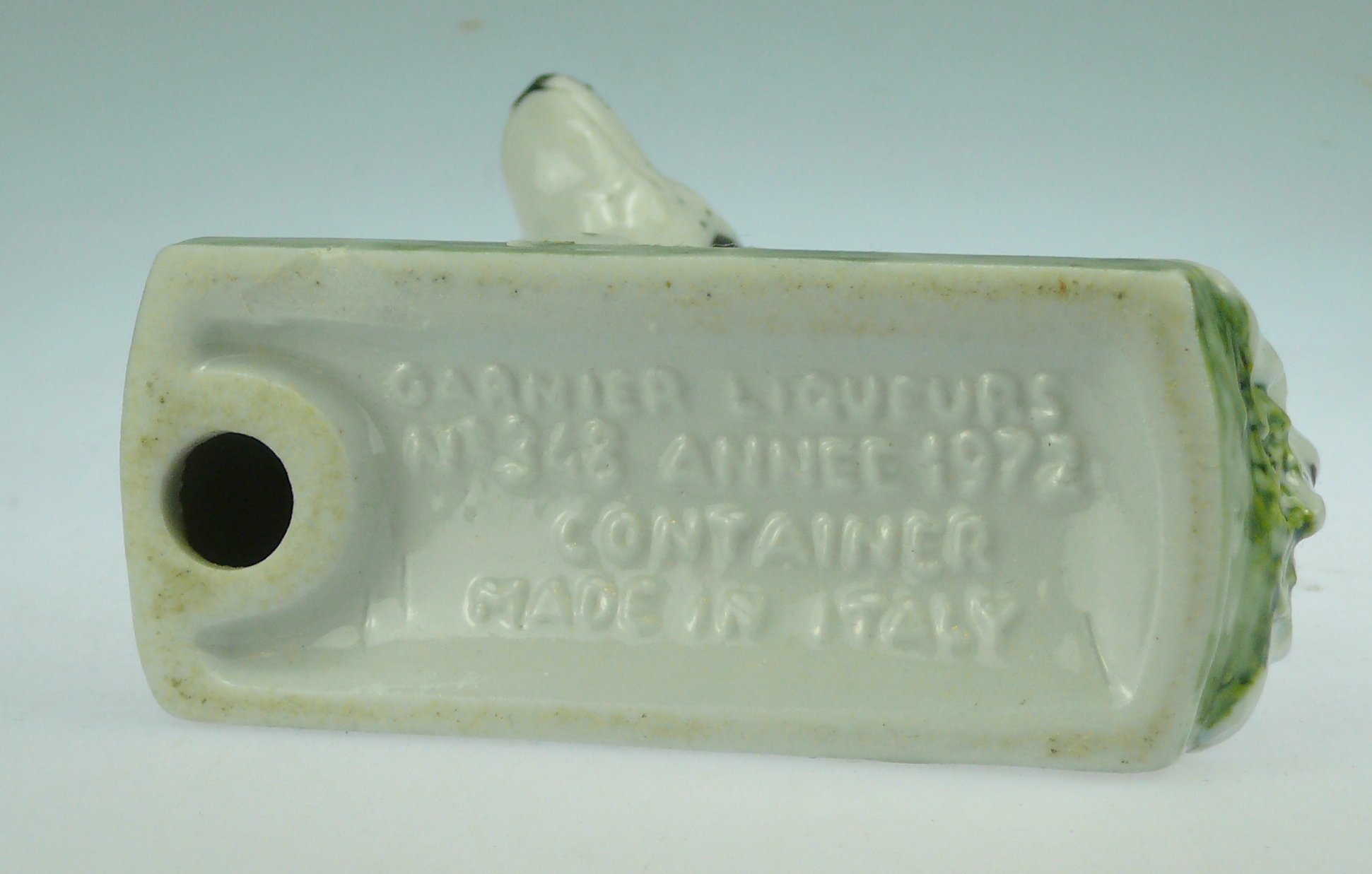 Avers : Bouteille miniature en céramique émaillée en forme de chien Dalmatien (Dalmatian dog). Le bouchon en liège se trouve à l’intérieur du flacon. Le flacon est estampillé en dessous : GARNIER LIQUEURS – N° 348 ANNEE 1972 – CONTAINER – MADE IN ITALY. Cette bouteille fait partie de la série des 6 miniatures « Les CHIENS » et figure sous le numéro 348 à la page 263 de notre ouvrage Catalogue Raisonné, « Les bouteilles Garnier Liqueurs », aux Editions : Monnaies d’Antan. 11 cm