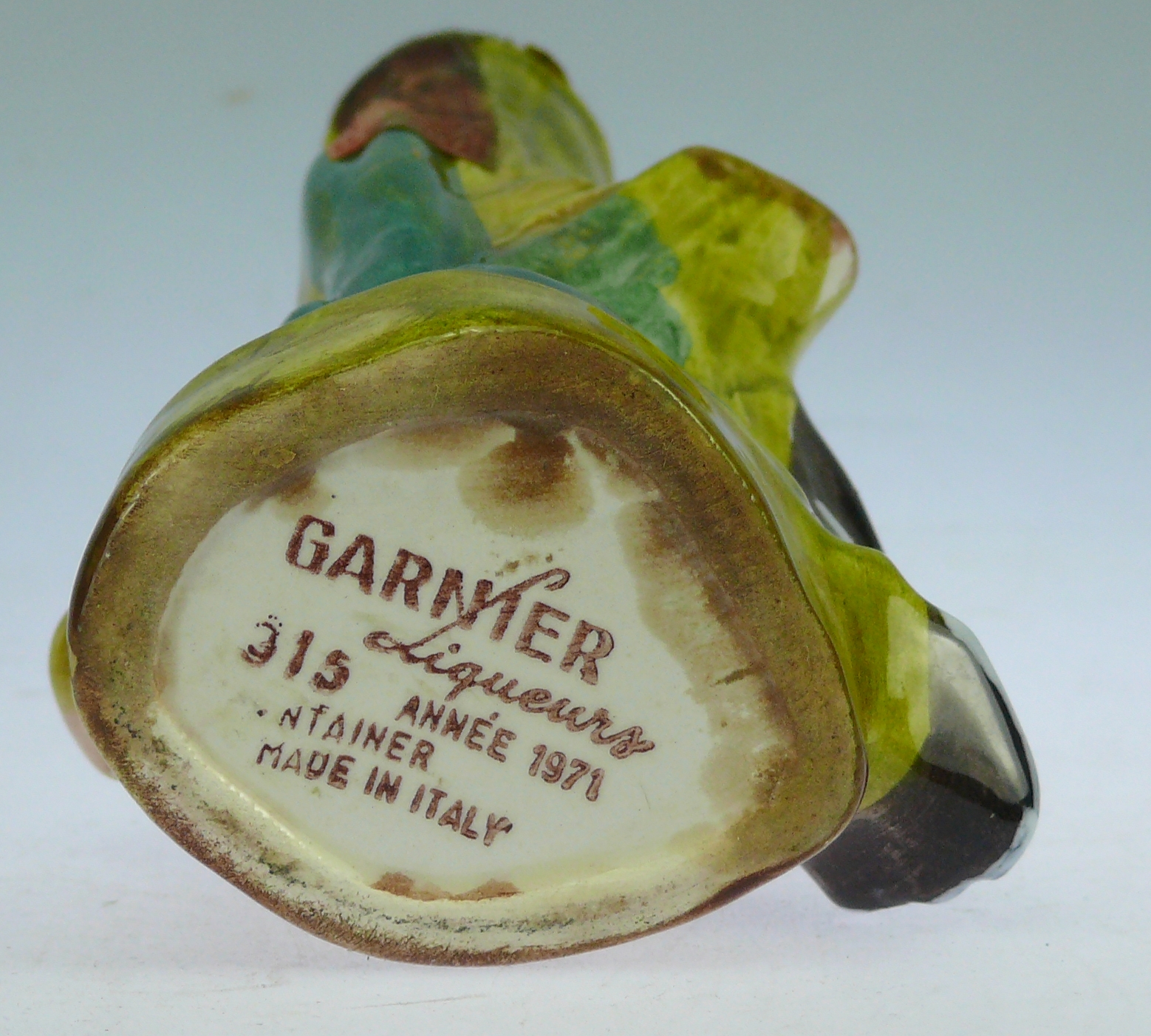 Avers : Bouteille miniature en céramique émaillée en forme d’oiseau d’Amérique représentant le Geai (Mocking bird). Le flacon est encore fermé par scellé au nom de Julius Wile mais le contenu s’est évaporé. En bas au dessus du nom américain de l’oiseau étiquette JULIUS WILE et sur l’oiseau : CREME DE MENTHE – CERTIFIED COLOR ADDED – GARNIER – 60 PROOF – 2 OZ – PRODUCT OF FRANCE. Le flacon est estampillé en dessous : GARNIER Liqueurs – 315 ANNEE 1971 – CONTAINER MADE IN ITALY. Cette bouteille fait partie de la série des 6 miniatures « Les oiseaux d’Amérique » et figure sous le numéro 315 à la page 255 de notre ouvrage Catalogue Raisonné, « Les bouteilles Garnier Liqueurs », aux Editions : Monnaies d’Antan. 14 cm