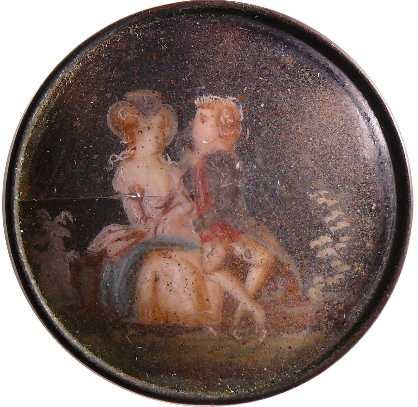 Avers : Bouton sous verre cerclé de cuivre et orné d’une peinture miniature représentant une scène galante entre un homme et une femme assis l’un près de l’autre. L’homme semble déclarer sa flamme et a une main posée sur les genoux de la dame. Une usure d’usage sur le dôme. Dimension : 35 mm.