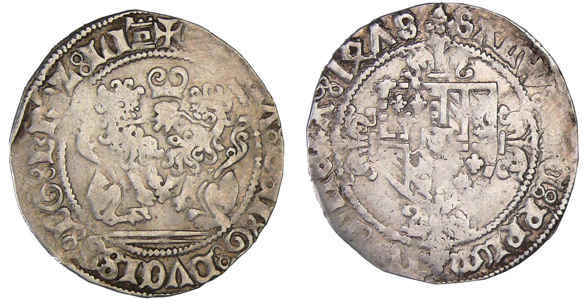 Avers : Marie de Bourgogne (1477-1482). A/ + mARIA° DEI° G’° DVCISS’° BG° BR’° Z° LI’. Deux lions assis face à face sur un trait d’exergue et surmontés d’un briquet.