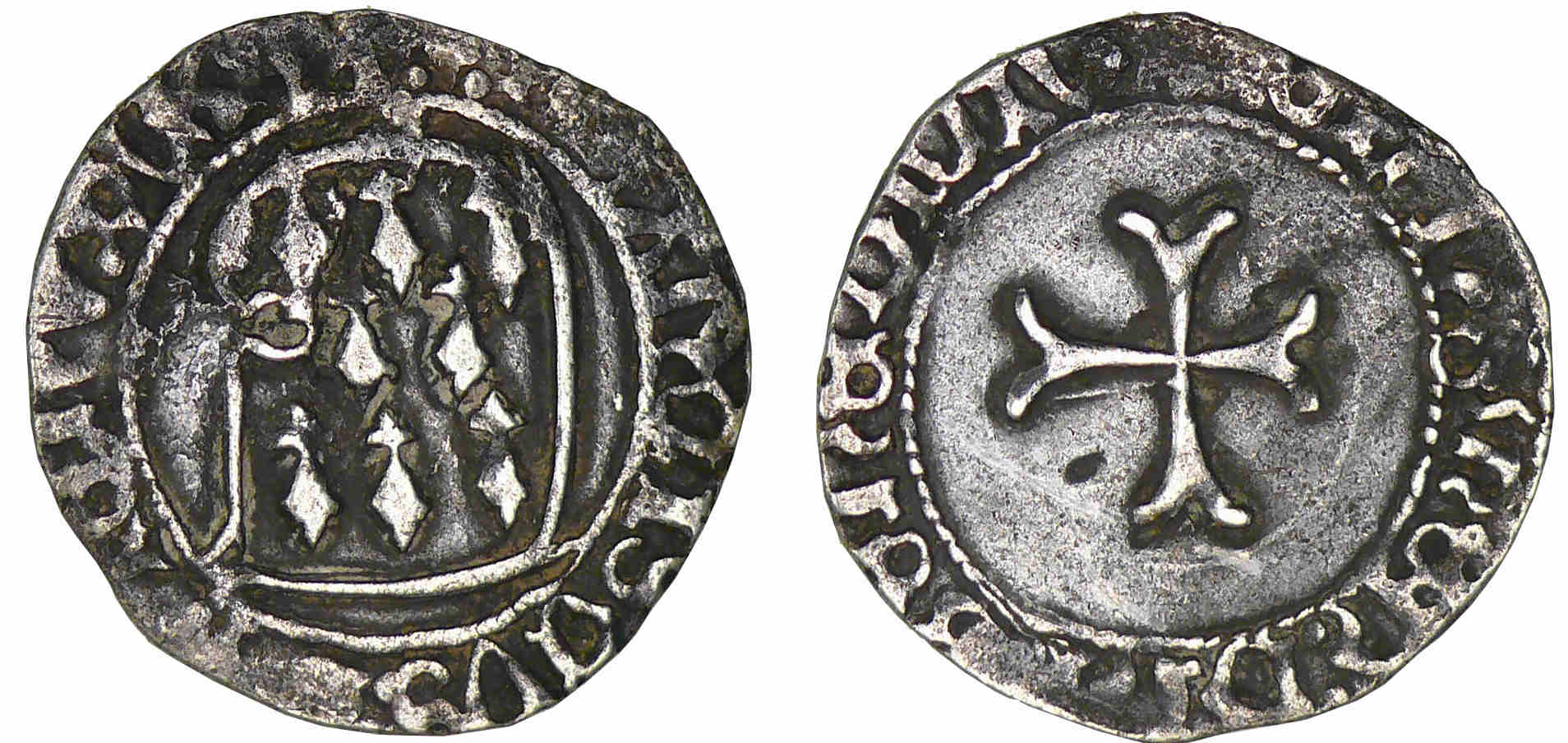 François Ier (1442-1450).A/ +: FRAnCISCVS: BRITOn: DVX: R: Targe échancrée à gauche, chargée de huit mouchetures.