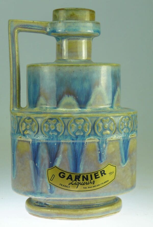 Avers : Broc en grés émaillé représentant un volcan décoré d’une frise de fleurs et d’une anse à angle droit. Flacon inscrit 70, de couleur bleu et violacé clair, avec son bouchon d’origine. Une étiquette Garnier, probablement récente sur la panse. Manufacture de production DENBAC. Bouteille référencée Gar-70, page 158 dans l’ouvrage Catalogue Raisonné, « Les bouteilles Garnier Liqueurs », aux Editions : Monnaies d’Antan. Ce flacon existe en 3 tailles dont une miniature et en multiples coloris, en émaillé ou mate. 19 cm