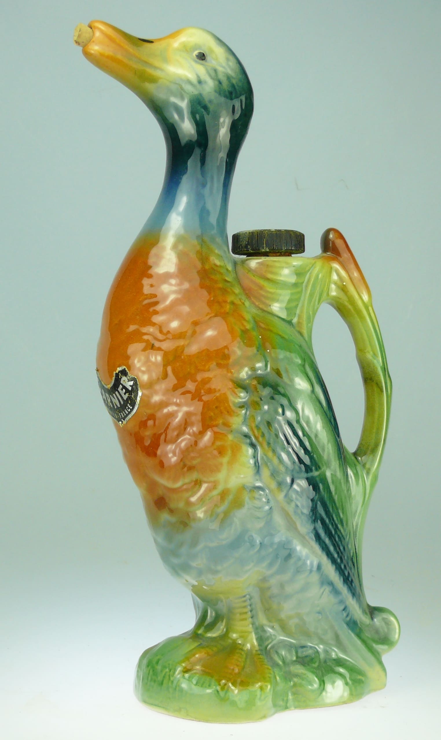 Avers : Très beau broc en céramique émaillée représentant un canard avec un trou sous le bec pour verser et une poignée de préhension comprenant une ouverture avec bouchon pour le remplissage. Ce modèle est inspiré du modèle de 1903. Le modèle présenté comporte encore une ancienne étiquette GARNIERE – ENGHIEN FRANCE et il est estampillé en dessous : GARNIER – ENGHIEN PARIS. Le broc est répertorié sous le numéro Gar-21, page 138 de notre ouvrage : Catalogue Raisonné, « Les bouteilles Garnier Liqueurs », aux Editions : Monnaies d’Antan. Manufacture de production : Saint Clément. 32 cm