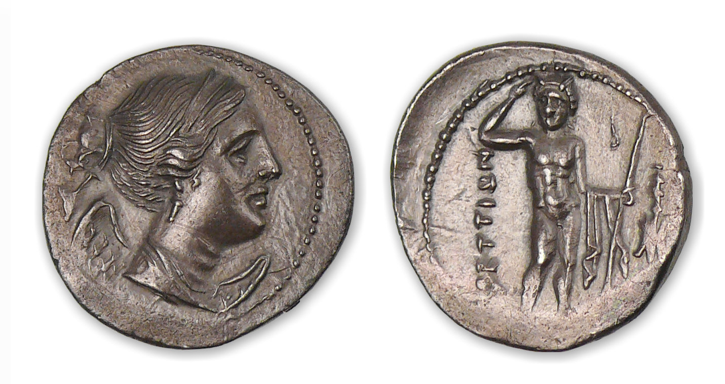 Revers : R/ BΡETTIΩN. Dionysos nu debout de face, portant sa main droite à sa tête, tenant un sceptre long.
