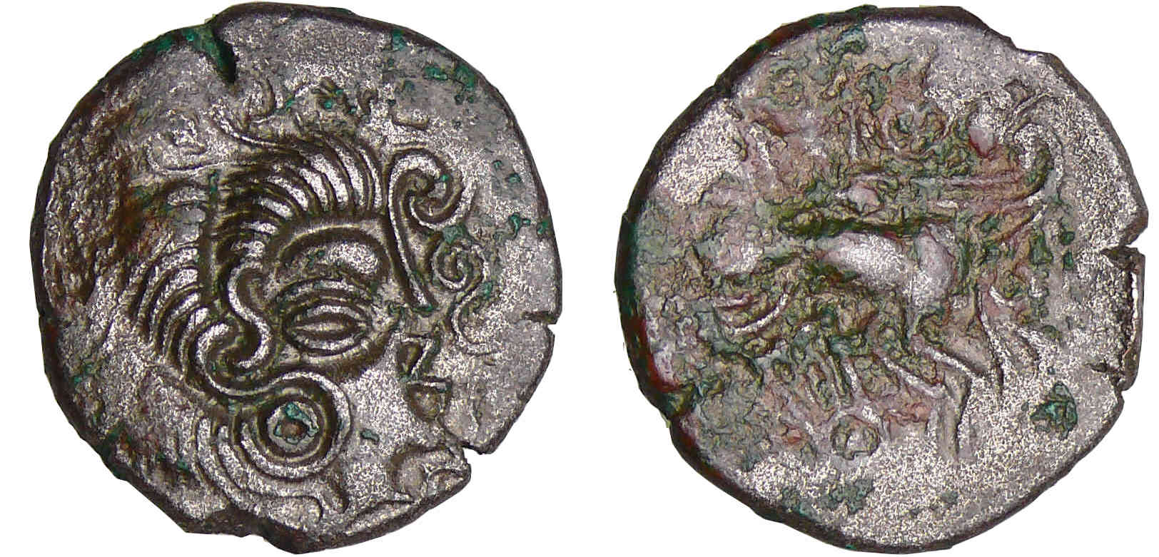 Revers : R/ Anépigraphe. Cheval androcéphale bridé galopant à droite. Entre les jambes, une lyre.