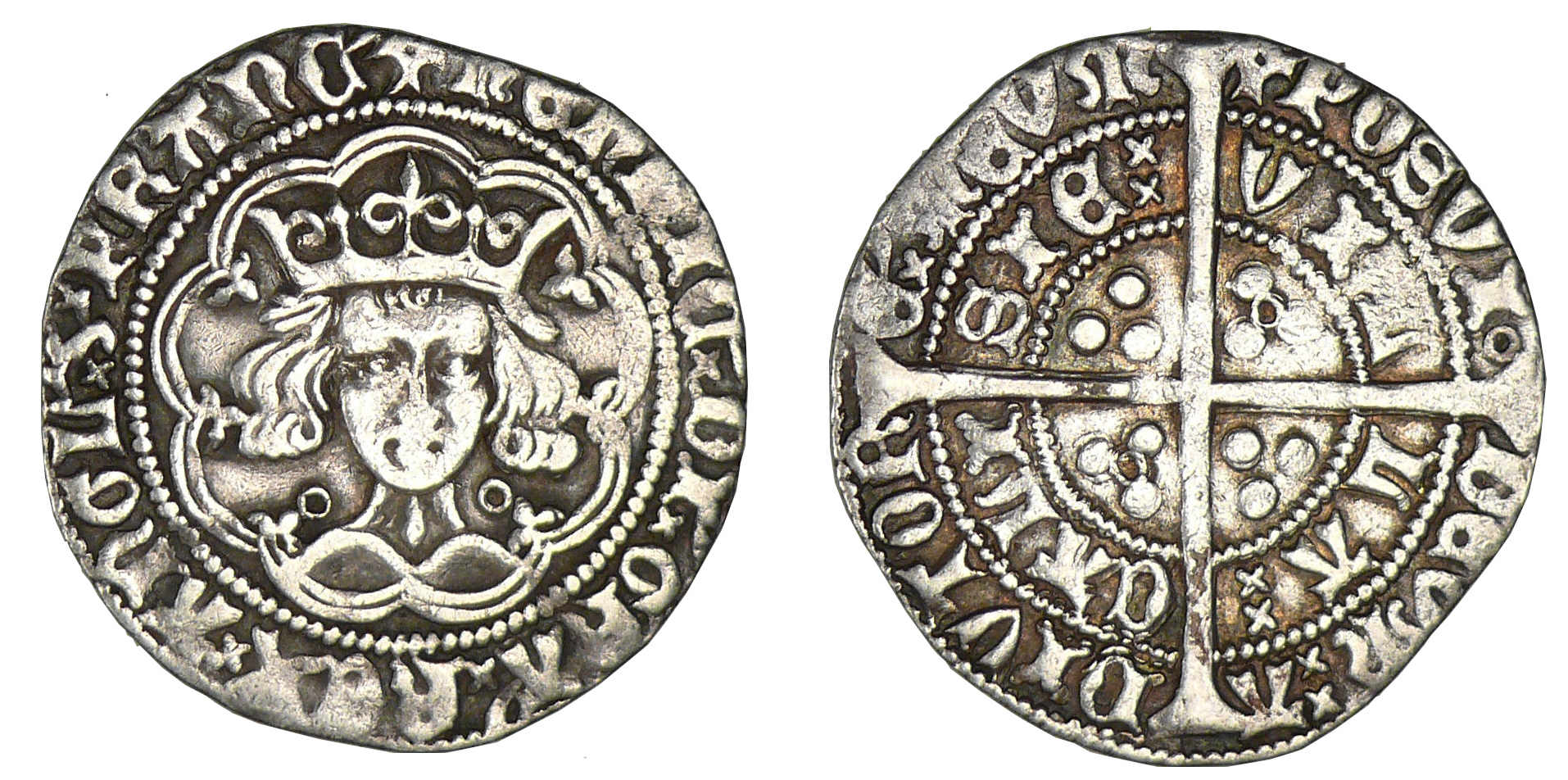 Avers : Henri V (1413-1422). A/ + hEnRIC’x DI’x GRA’x REXx AnGL’x Z FRAnC. Buste de face de Henri V, le cou accosté de deux annelets.