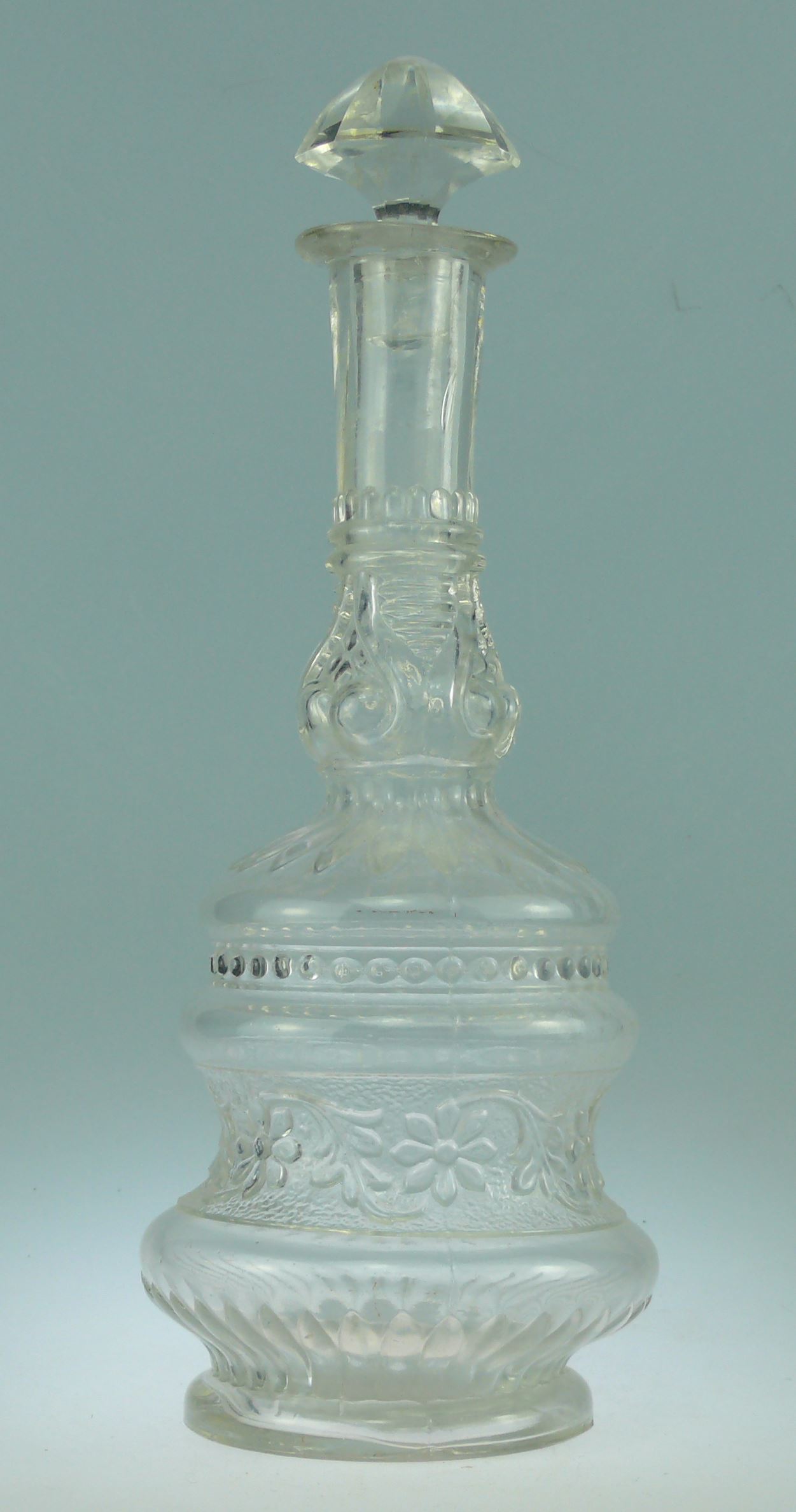 Avers : Carafe en verre moulé avec son bouchon à facettes, panse arrondie à plusieurs niveaux, col long très joliment décoré à la base. La panse est ornée de frises de fleurs et perles et de deux frises de feuilles, l’une partant de la base et montant vers la panse et l’autre partant de la base du goulot et descendant vers la panse. 27.5 cm bouchon compris.