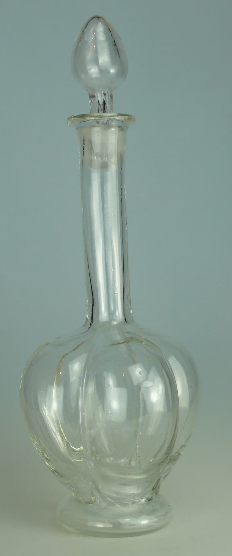 Avers : Carafe en verre incolore sur piédouche, à panse carrée composée de 4 côtés bombés, col long à bord épais évasé. La carafe a son bouchon d’origine en forme de cône. Cette carafe est le modèle numéro 1073 du catalogue Legras de 1908. Dimensions : 29 cm