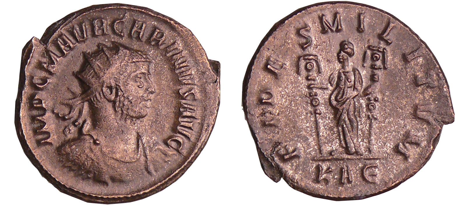 A/ IMP C M AVR CARINVS AVG Buste radié et cuirassé à droite.