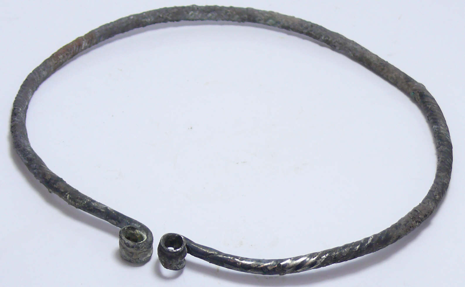 Avers : Beau torque ou collier de cou en argent torsadé terminé par 2 boucles. L’objet comporte quelques concrétions calcaires. Dimension : 130 mm.