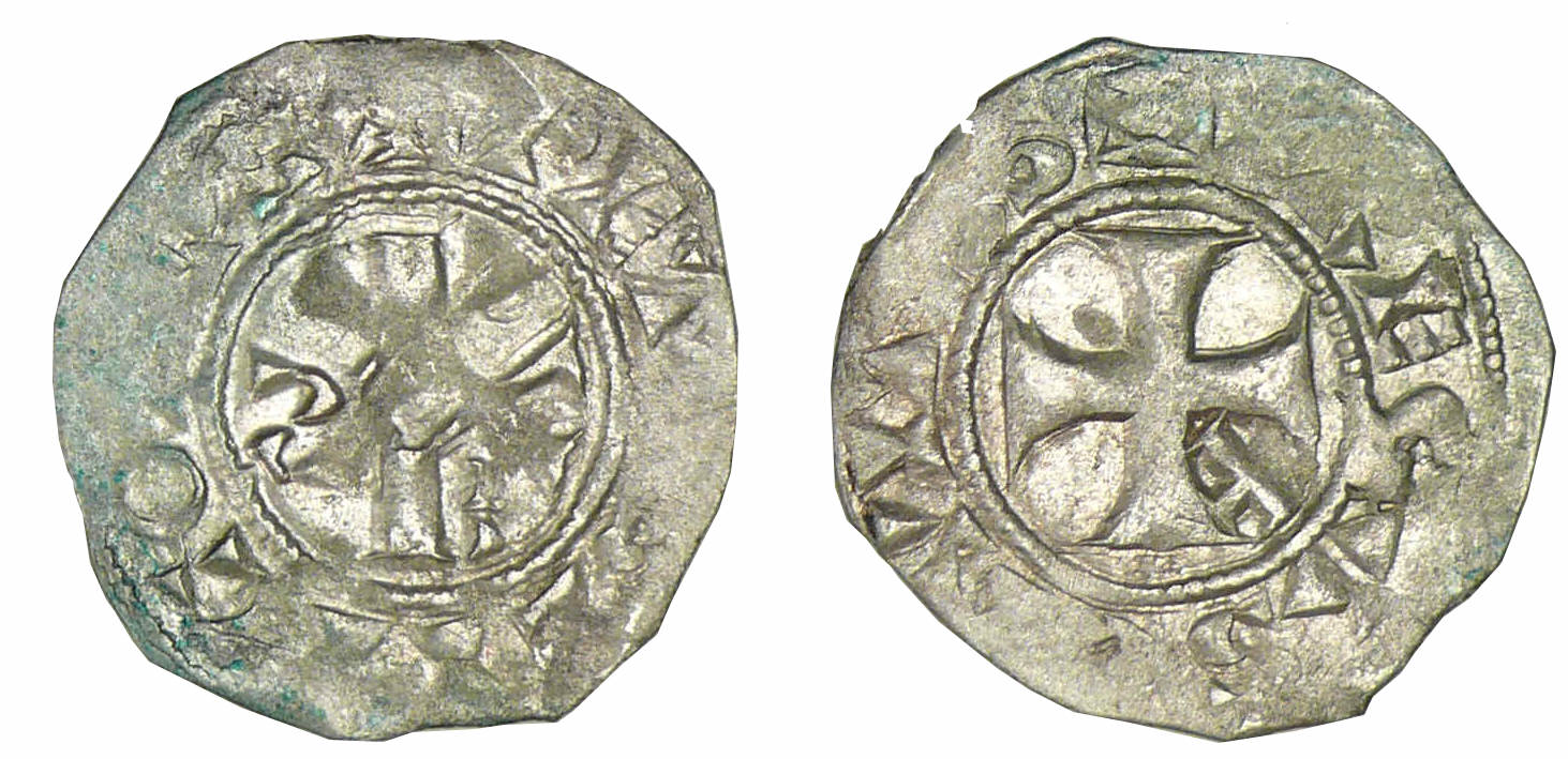 R/ + TRECAS CIVITAS. Croix cantonnée d’une croisette.