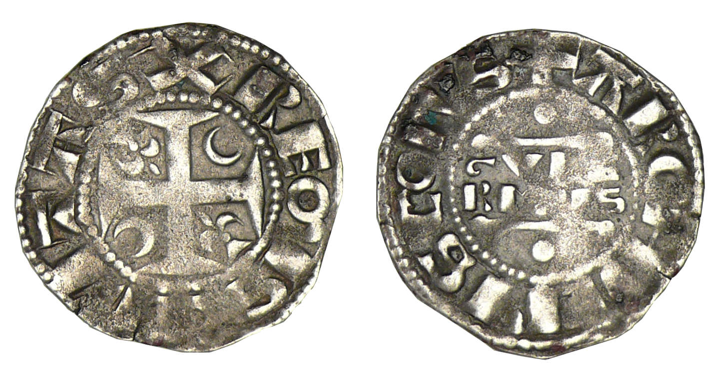 R/ X REMIS CIVITAS. Croix cantonnée aux 1 et 4 d’un lis, aux 2 et 3 d’un croissant.