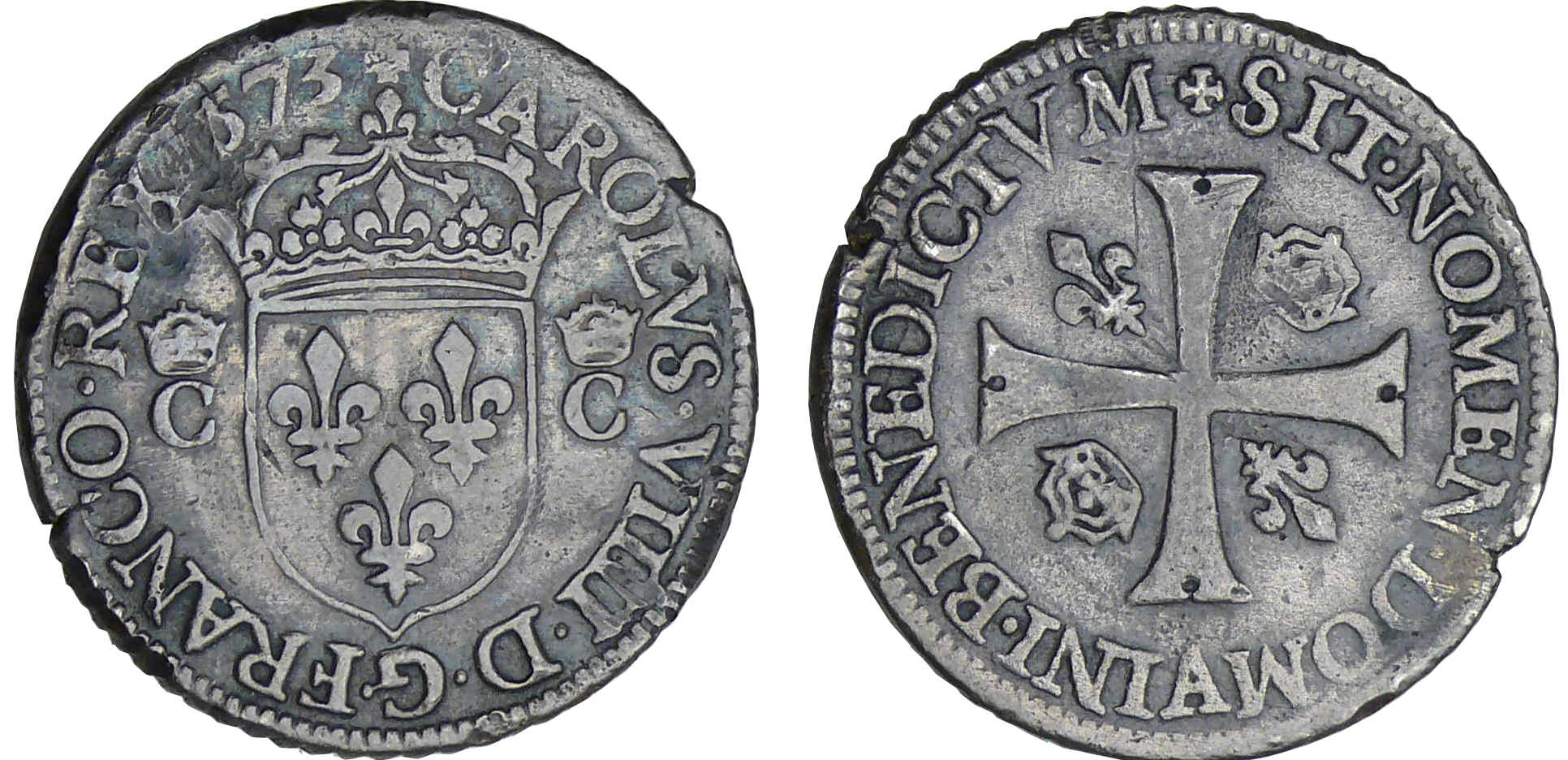 Avers : A/ CAROLVS. IX. D. G. FRANC. R. Ecu de France couronné et accosté de deux C.