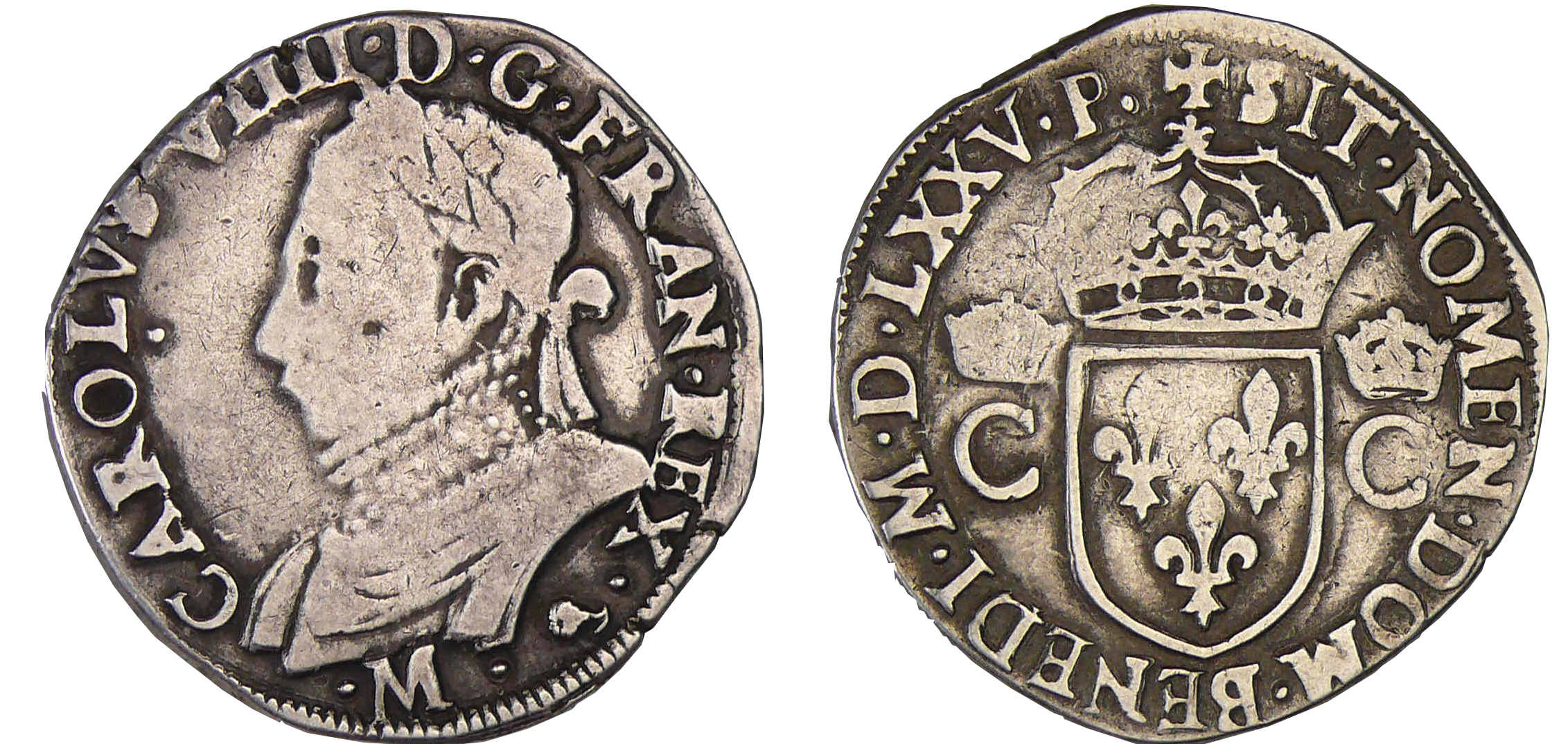Avers : A/ CAROLVS. VIIII. D. G. FRAN. REX. Buste lauré et cuirassé à gauche. Atelier sous le buste.