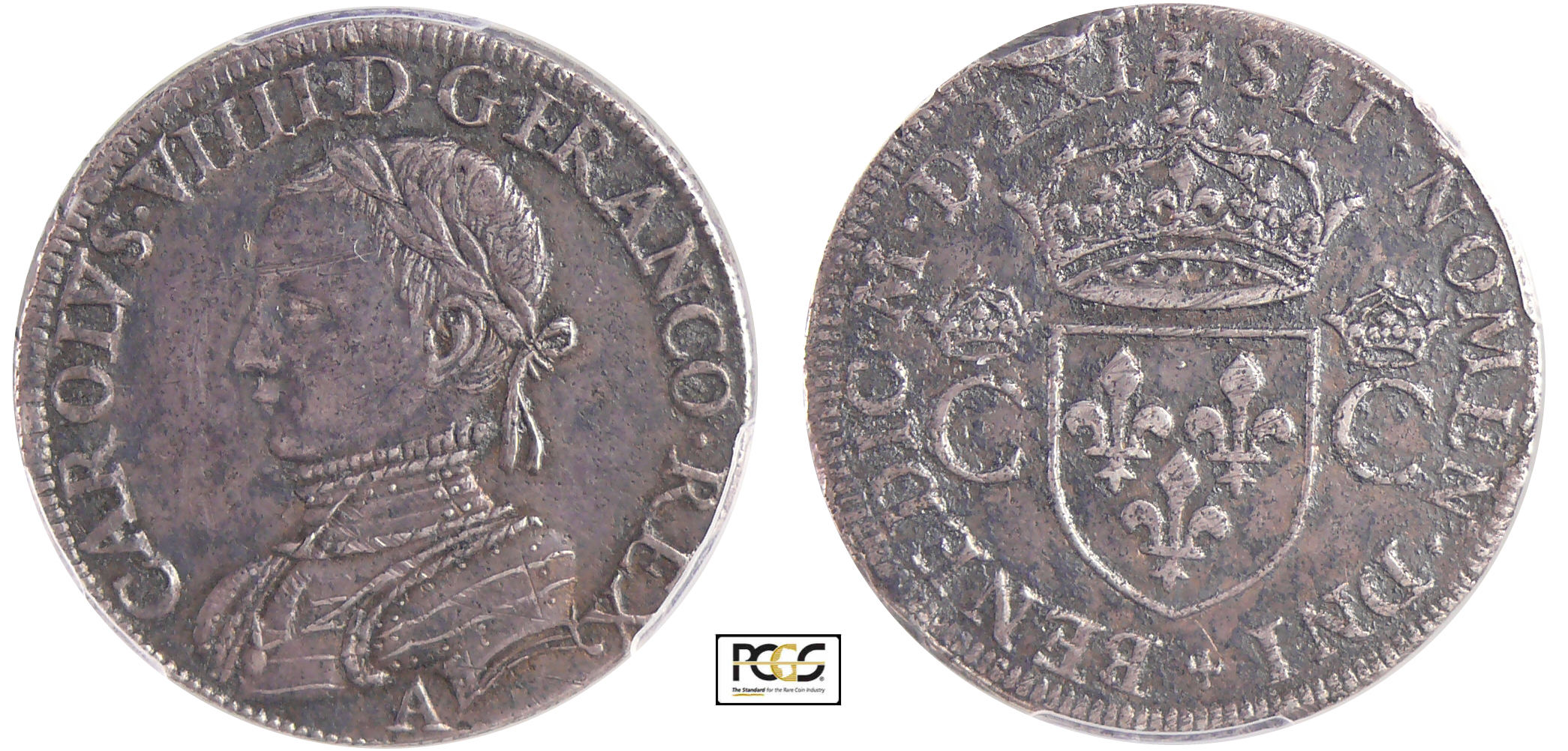 A/ CAROLVS VIIII D G FRAN REX. Buste lauré et cuirassé à gauche.