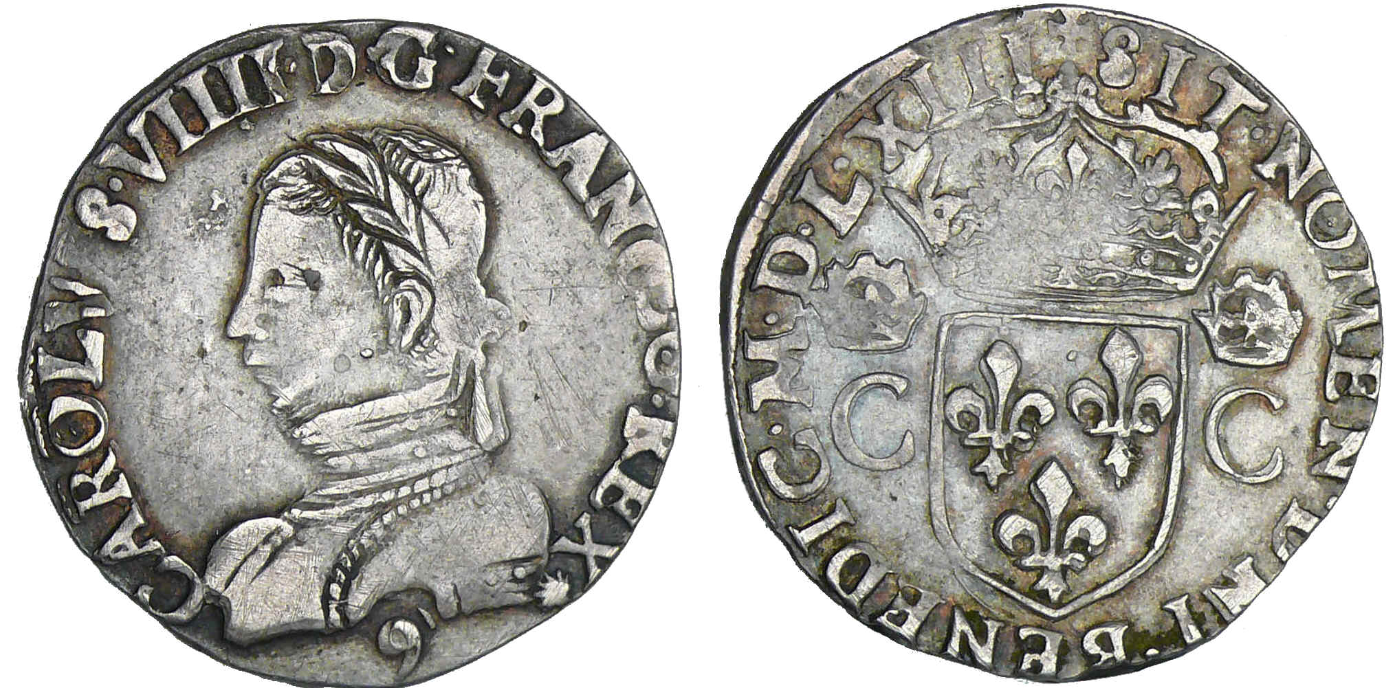 A/ CAROLVS VIIII D G FRANCO REX. Buste lauré et cuirassé à gauche.