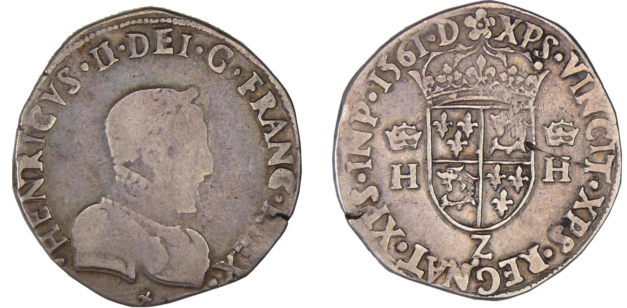 R/ (fleur) XPS. VINCIT. XPS. REGNAT. XPS. INP. (millèsime). D. Ecu de France-Dauphiné entre deux H couronnés. Lettre d’atelier sous l’écu.