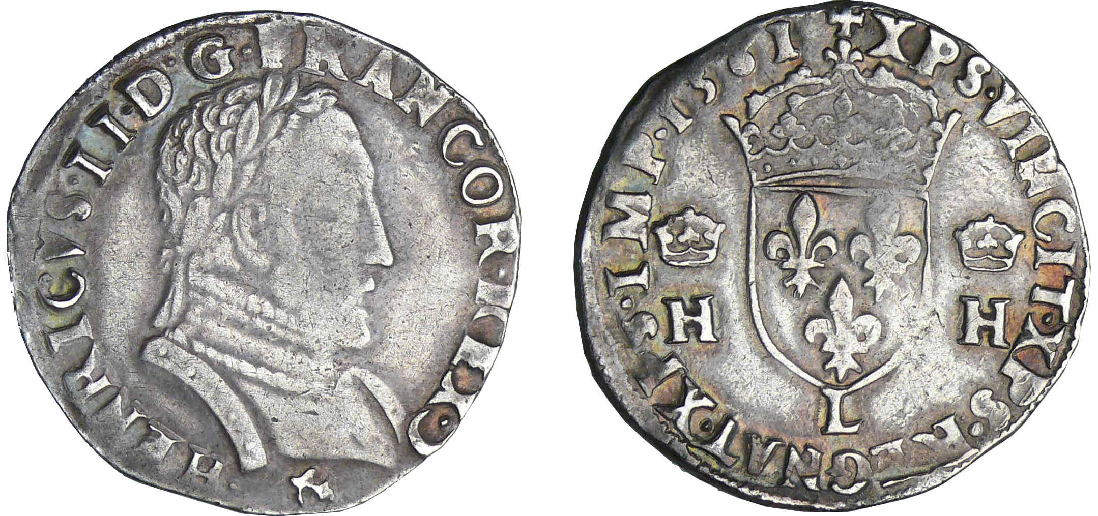 Avers : A/ HENRICVS. II. D. G. FRANCOR. REX. Buste à droite, cuirassé et tête laurée.