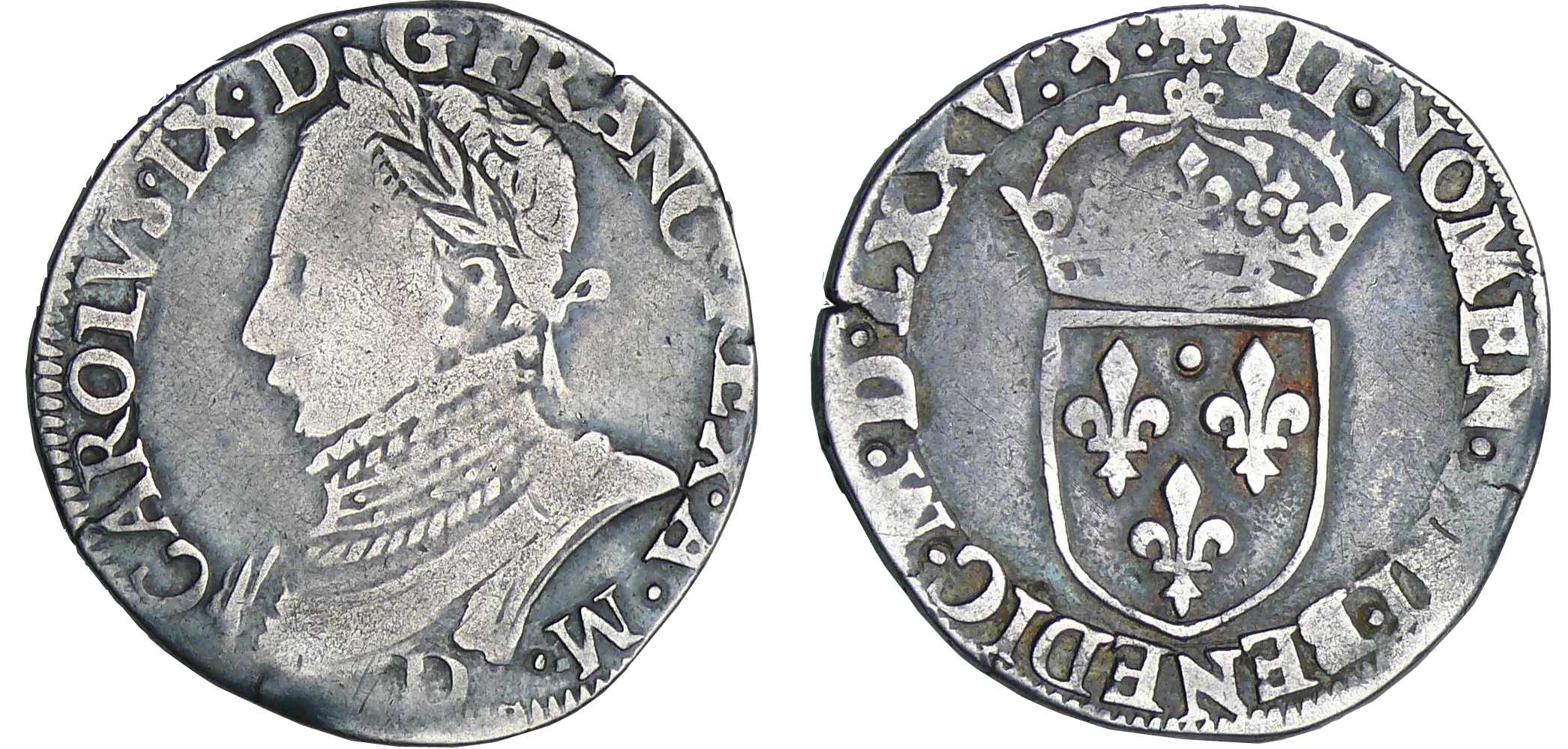 A/ CAROLVS. IX. D. G. FRANC. REX. A. M. Buste lauré et cuirassé à gauche.