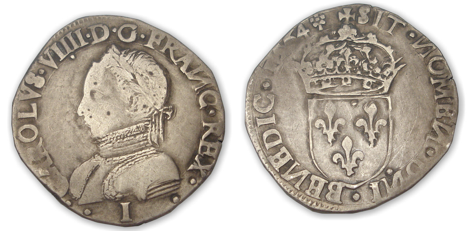 A/ CAROLVS. VIIII. D. G. FRANC. REX. (N rétrograde) Buste lauré et cuirassé à gauche.