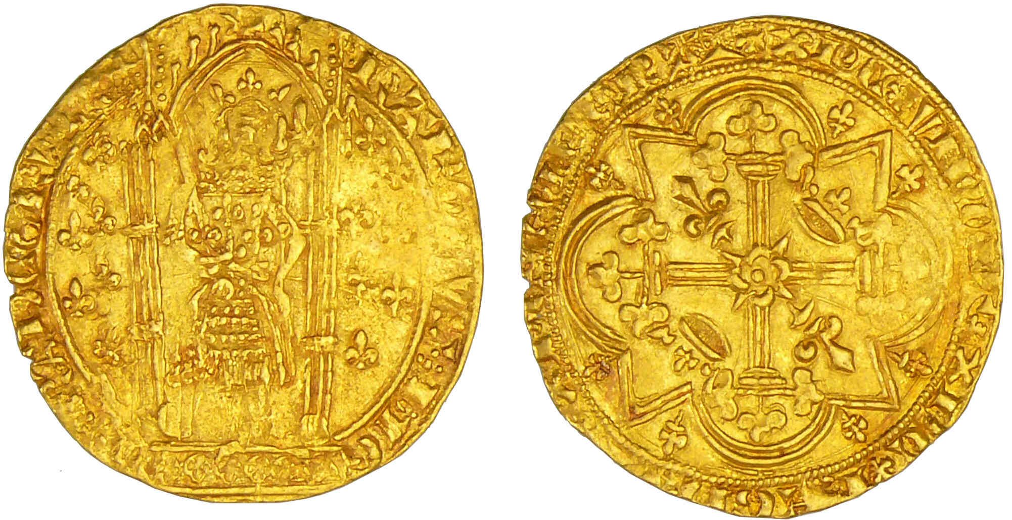 Avers : A/ KAROLVS DI GR FRAnCORV REX. Charles V, couronné, debout sous un portail gothique accosté de lis, portant une cotte d’armes fleurdelisée, tenant une épée et la main de justice.