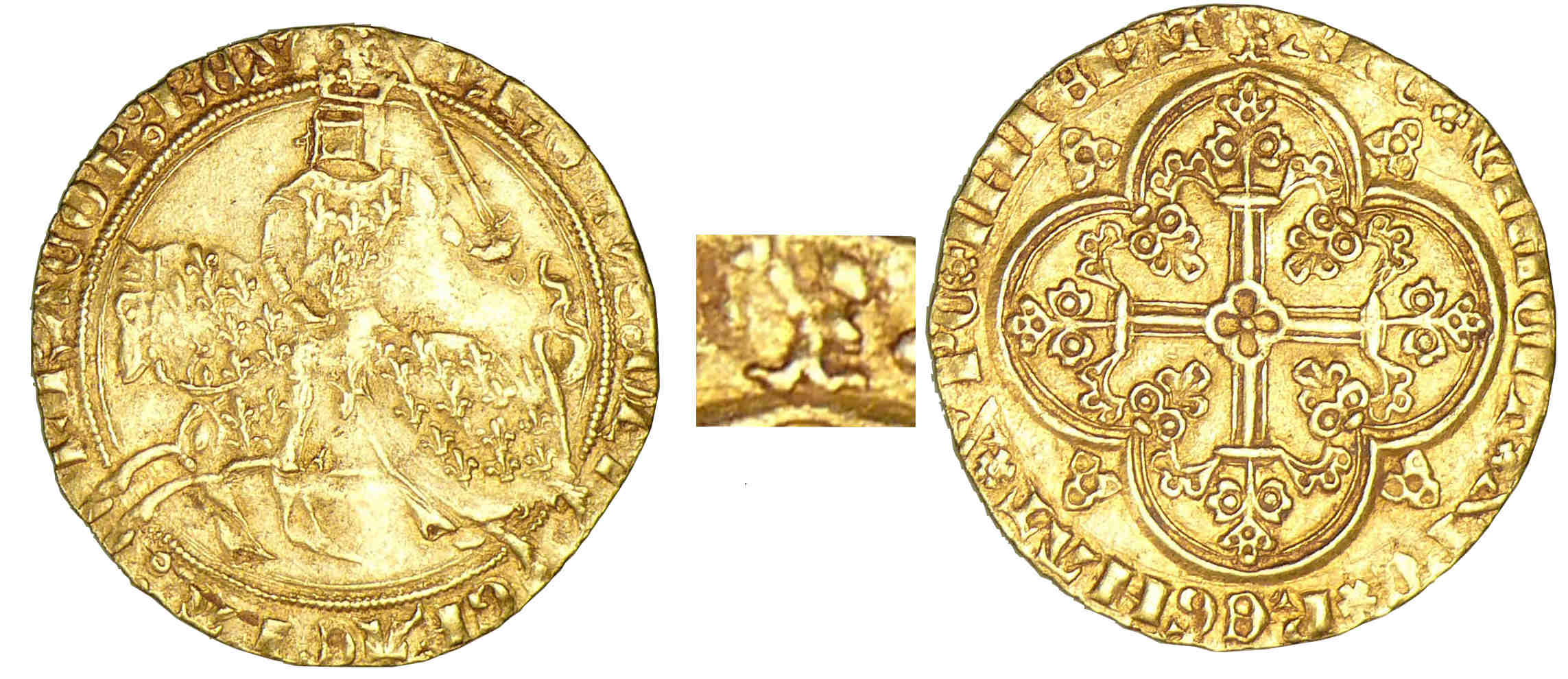 Avers : A/ KROLVS• DEI – GRACIA• FR-ANCOR• REX, (ponctuation par deux annelets pointés superposés). Charles V chevauchant et galopant à gauche, l’épée haute, coiffé d’un heaume couronné, sommé d’un lis, portant par-dessus sa cotte de mailles une cotte d’armes fleurdelisée , le caparaçon du cheval est fleurdelisé.