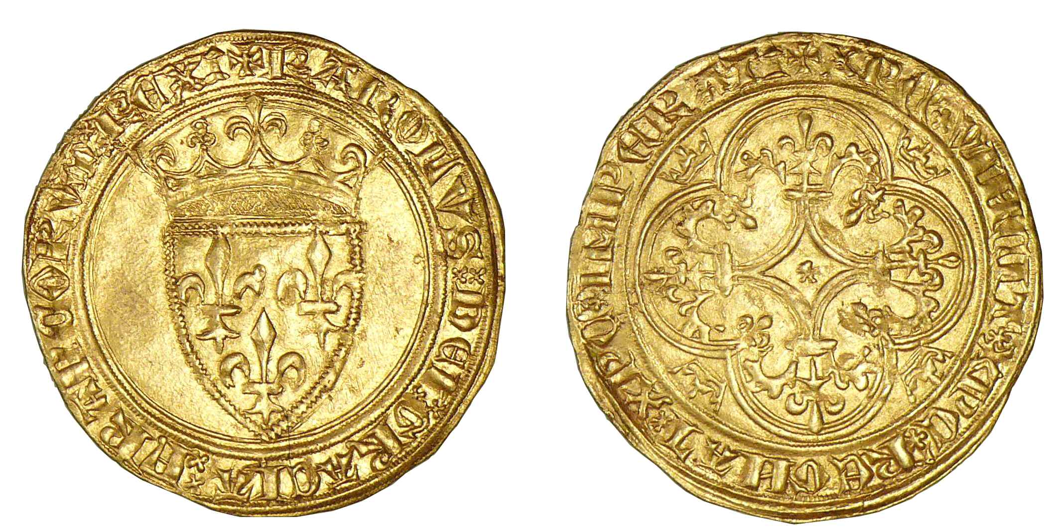 Revers : R/ + XPC* VINCIT* XPC* REGANT* XPC* IMPERAT. Croix fleurdelisée et feuillue, avec * dans un losange curviligne en cœur. Le tout dans un quadrilobe cantonné de quatre couronnelles.