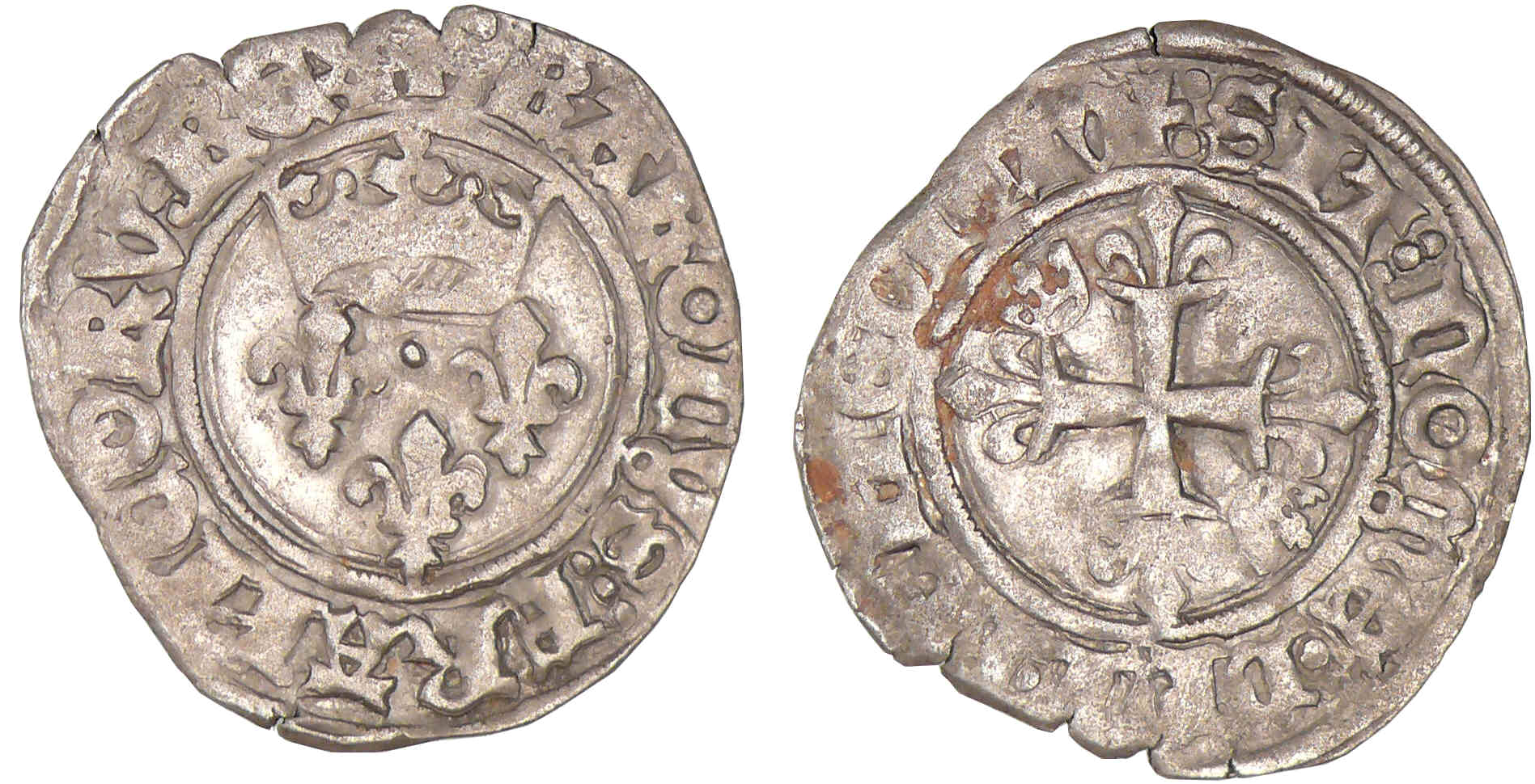 Avers : A/ + KAROLVS:FRANCORV:REX. Trois lis posés sous une couronne trèflée.