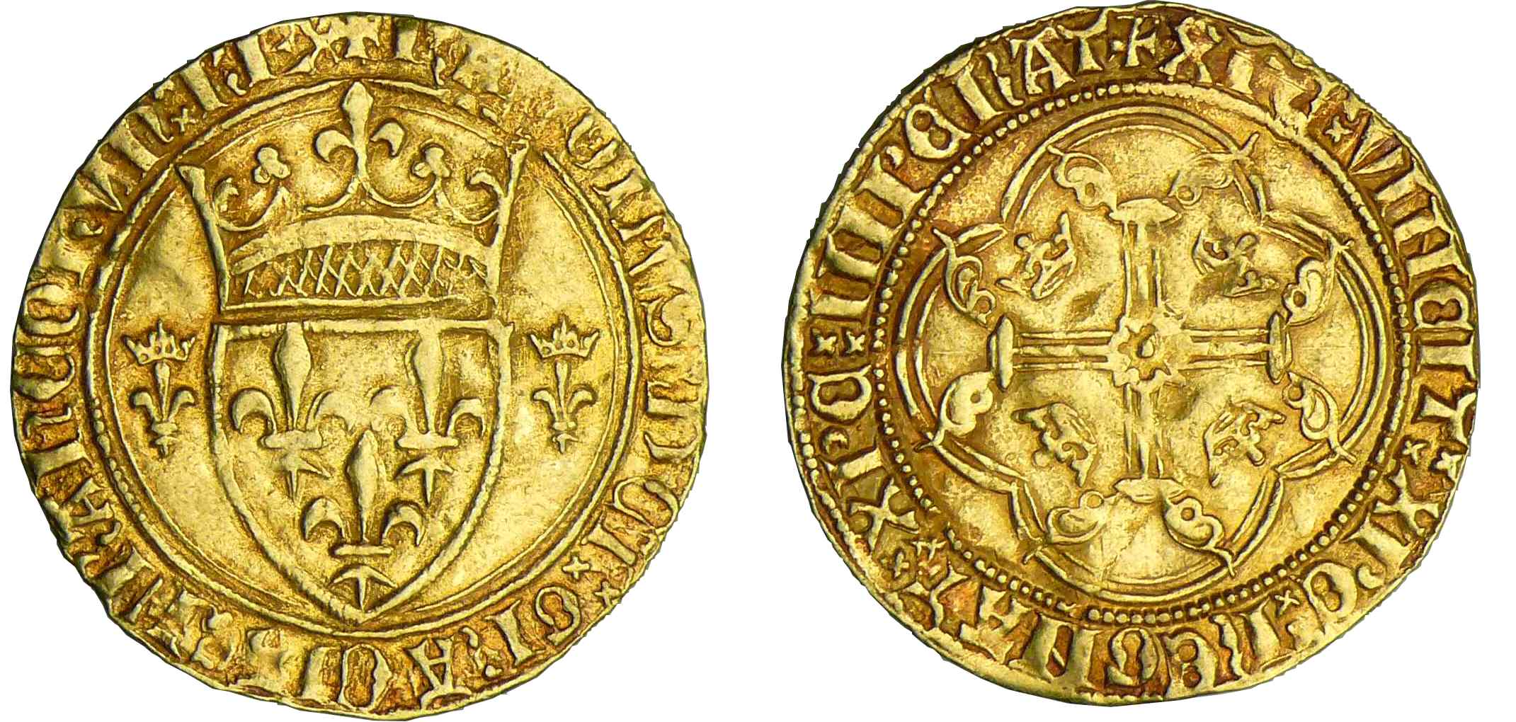 Avers : A/ + KAROLVS• DEI GRACIA• FRAnCORVm• REX. Ecu de France couronné et accosté de deux lis couronnés.