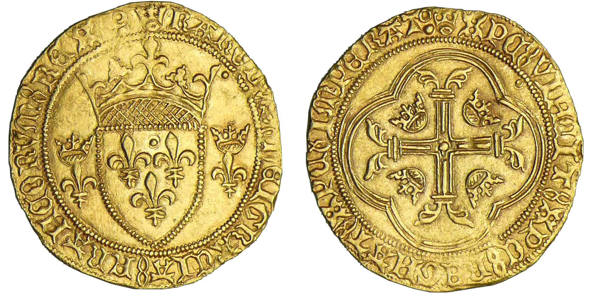 Avers : A/ (couronnelle) KAROLVS• DEI GRACIA• FRAnCORVm• REX. Ecu de France couronné et accosté de deux lis couronnés.