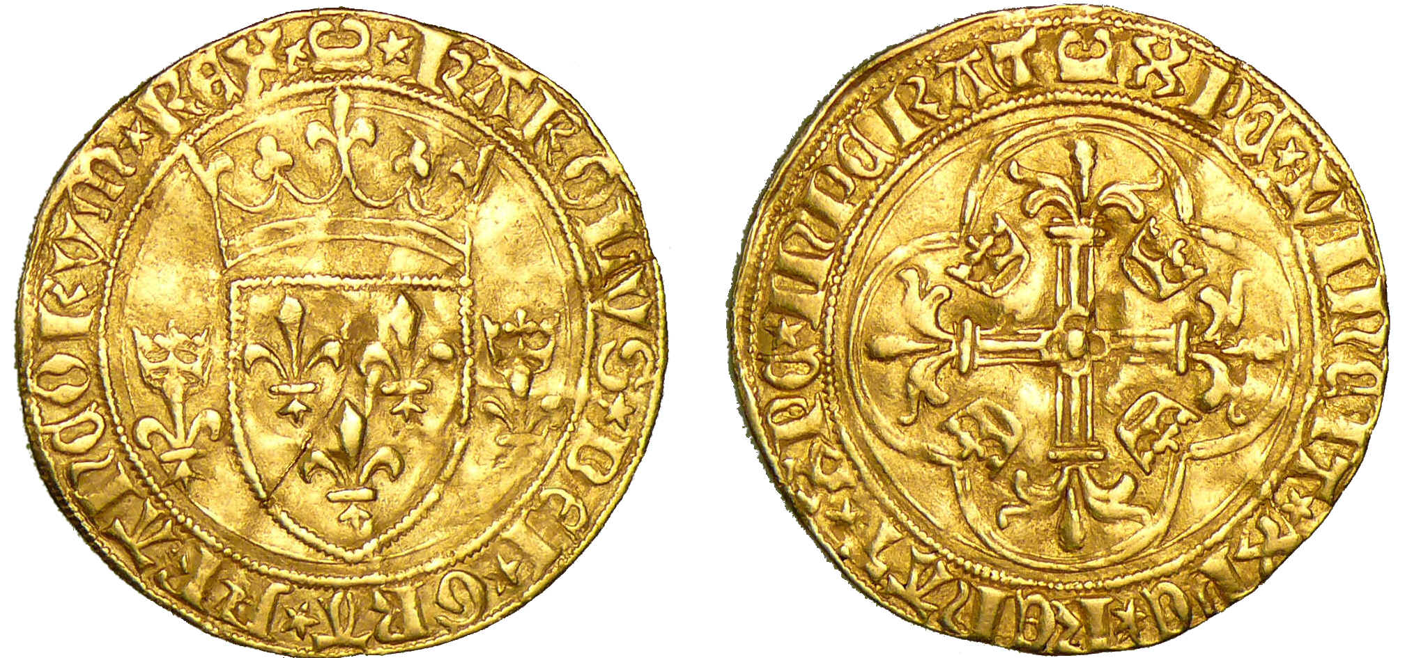 Avers : A/ (briquet) KAROLVS * DEI * GRA * FRAnCORVM * REX *. Trois lis posés aux 2ème et 1er cantons, sous une couronne.