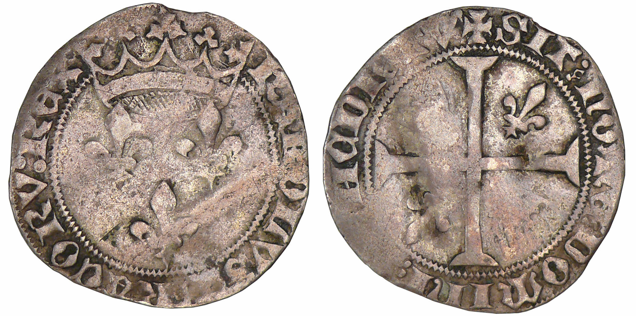 Avers : A/ + KAROLVS* FRANCORVm* ReX*. Trois lis posés aux 2ème et 1er cantons sous une couronne. Couronne coupant la légende.