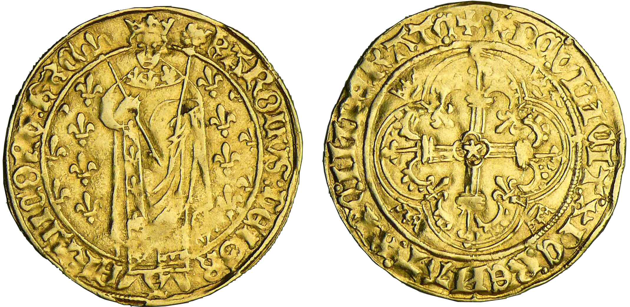 Avers : A/ + -KAROLVSx DEIx GRA- xFRAxCORVx REX C. Le roi couronné debout de face, vêtu d’une robe et d’un manteau fleurdelisés, tenant un sceptre cruciforme de la main droite et un sceptre fleurdelisé de la gauche.