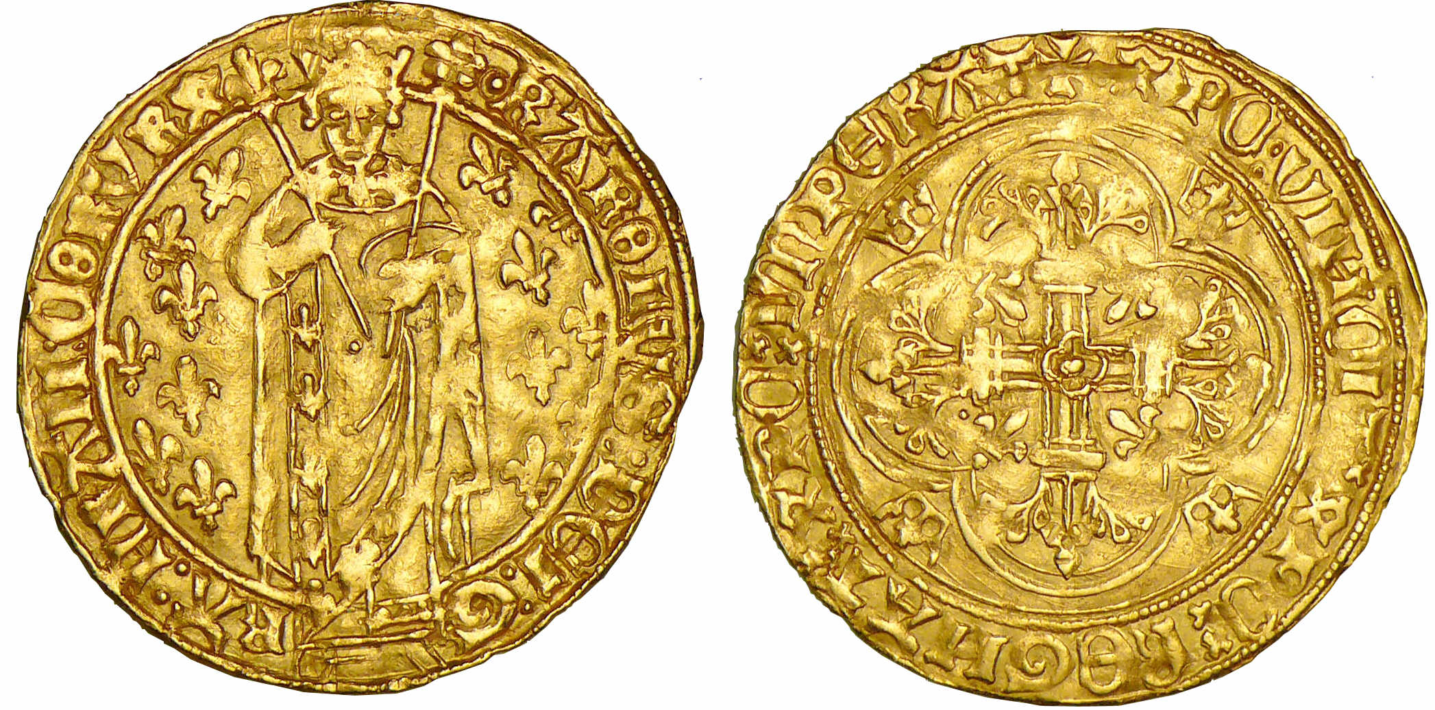 Avers : A/ + -KAROLVSx DEIx GRA- xFRAxCORVx REX C. Le roi couronné debout de face, vêtu d’une robe et d’un manteau fleurdelisés, tenant un sceptre cruciforme de la main droite et un sceptre fleurdelisé de la gauche.