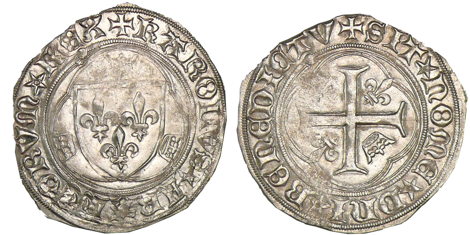 A/ KAROLVS* FRANCORVM* REX• Ecu de France entre trois couronnelles dans un trilobe.