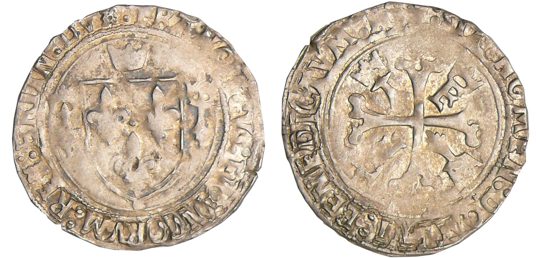 Avers : A/ Ç :KARoLVS: FRAn6oRVm: RaX: n: – Grand K couronné et accosté d’un lis et d’une hermine.