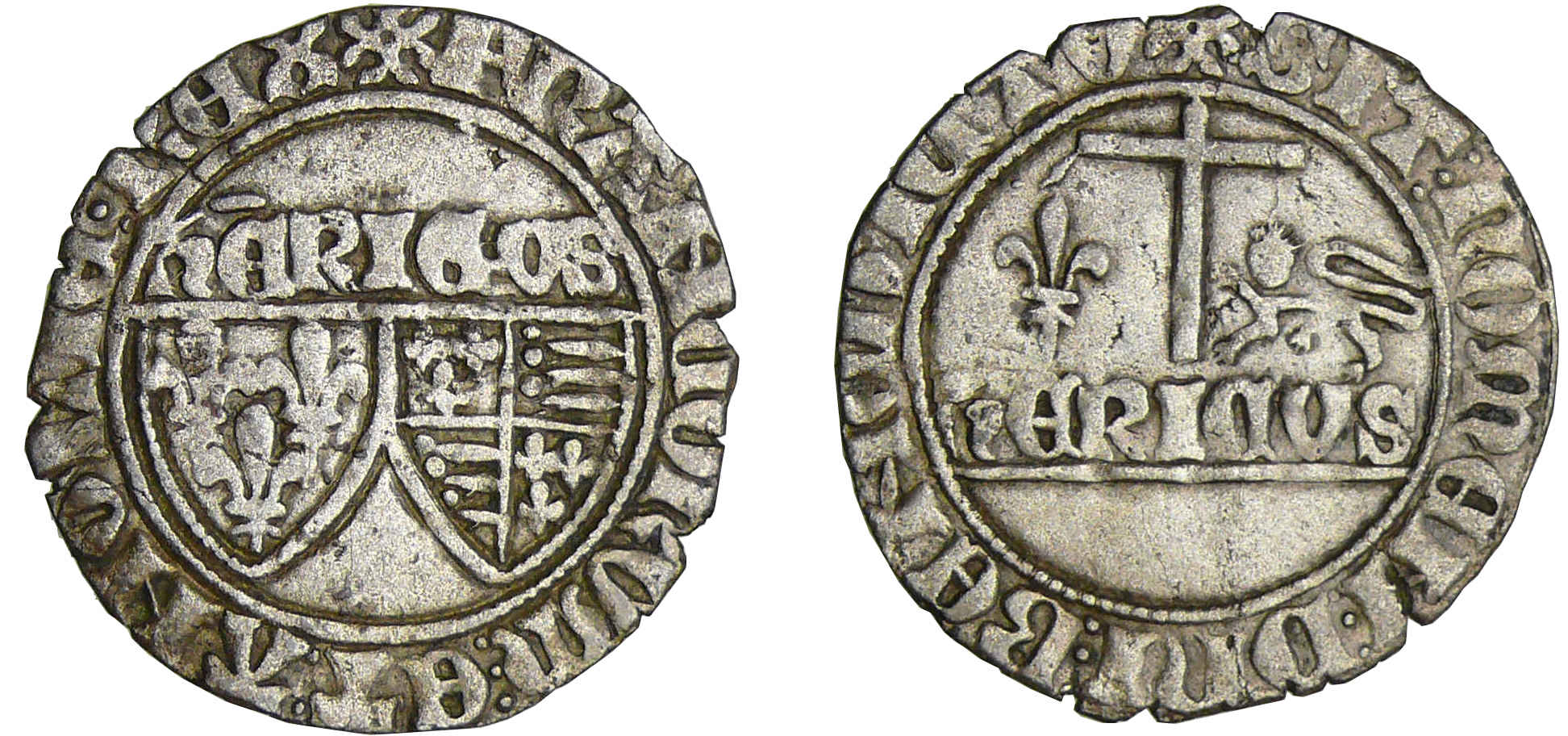 A/ (croix ancrée) FRANCORVM ET ANGLIE REX. Ecus accostés de France et de France-Angleterre. Au-dessus des écus, HERICVS.