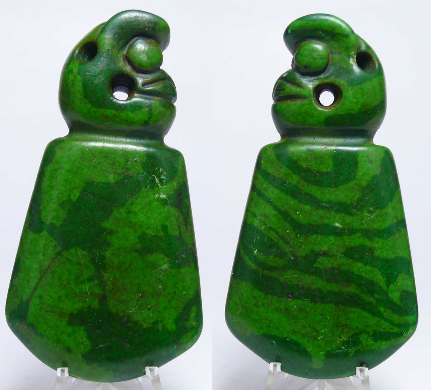 Jolie hâche idole en pierre verte polie rubannée. 85 mm.