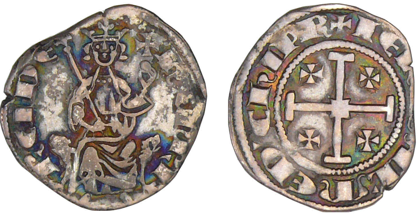 Avers : Henri II second règne (1310-1324). A/ HENRI REI DE. Le roi assis de face sur un trône à tête de lion.