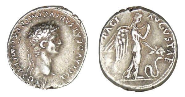 R/ PACI AVGVSTAE. La Paix avec les emblèmes de Némésis, marchant à droite et tenant un caducée, elle est précédée par un serpent.