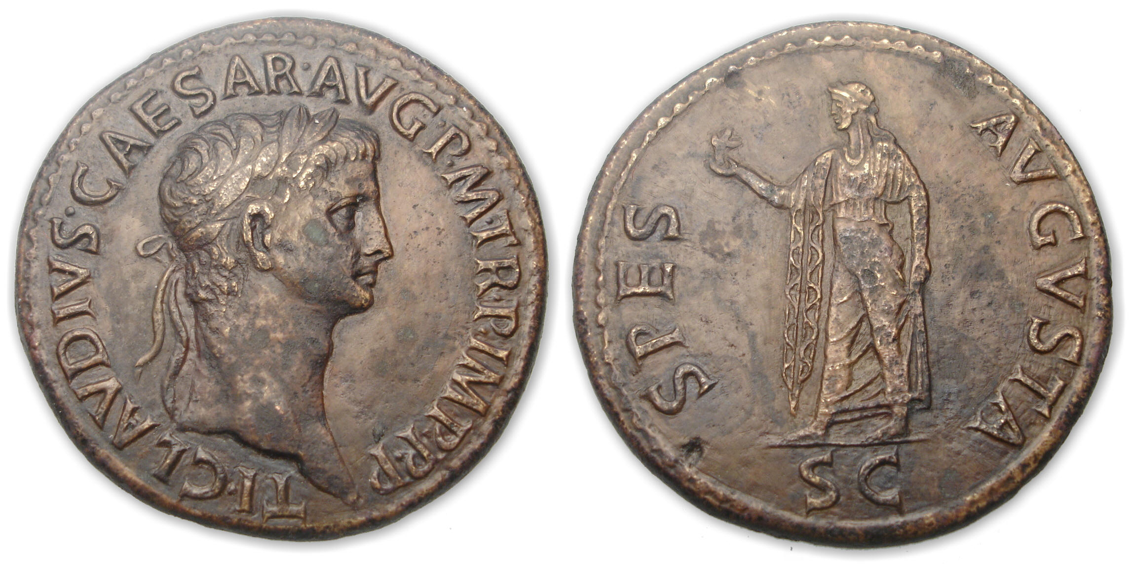 Avers : A/ TI CLAVDIVS CAESAR AVG PM TR P IMP P P Tête laurée de Claude à gauche.