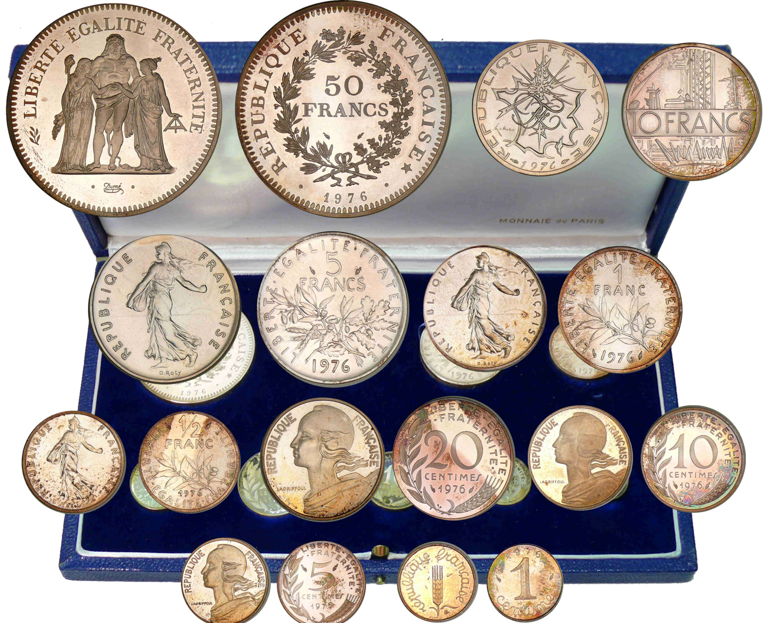 Avers : Serie comprenant la 50 francs, 10 francs, 5 francs, 1 franc, 1/2 franc, 20 centimes, 10 centimes, 5 centimes et 1 centime en piefort argent.